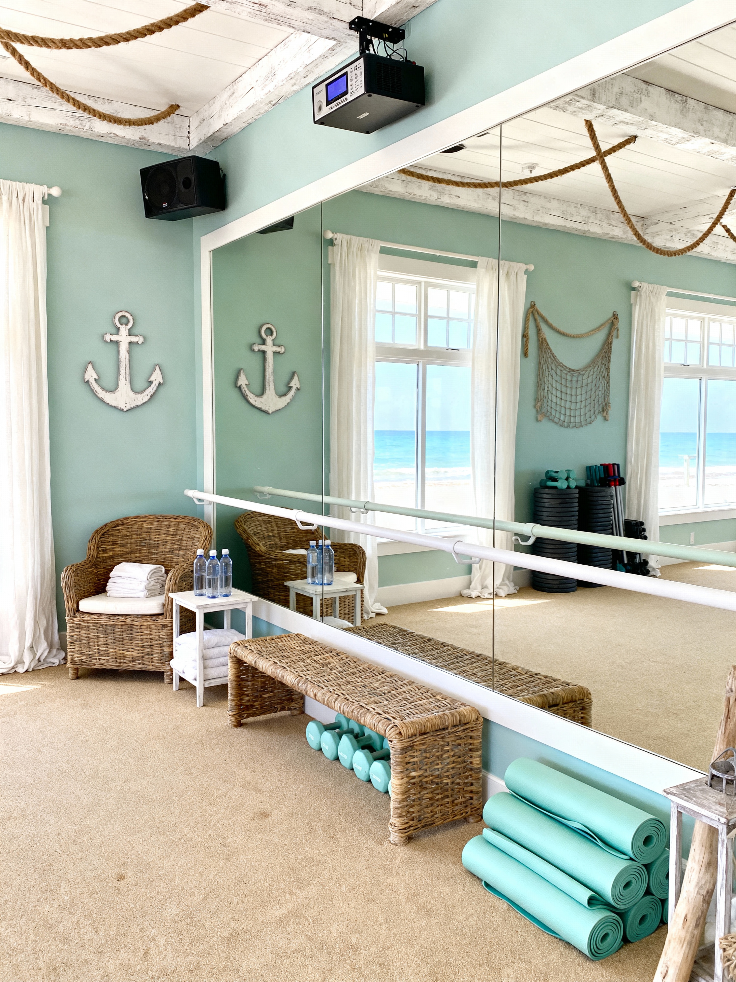 dance studio with coastal style with speaker and water bottles and towels and mirrors and sound system and ballet barre and music player and exercise equipment. . with nautical decor and white decor and seaside colors and beach vibes and relaxed style and wicker furniture and natural materials and sand tones