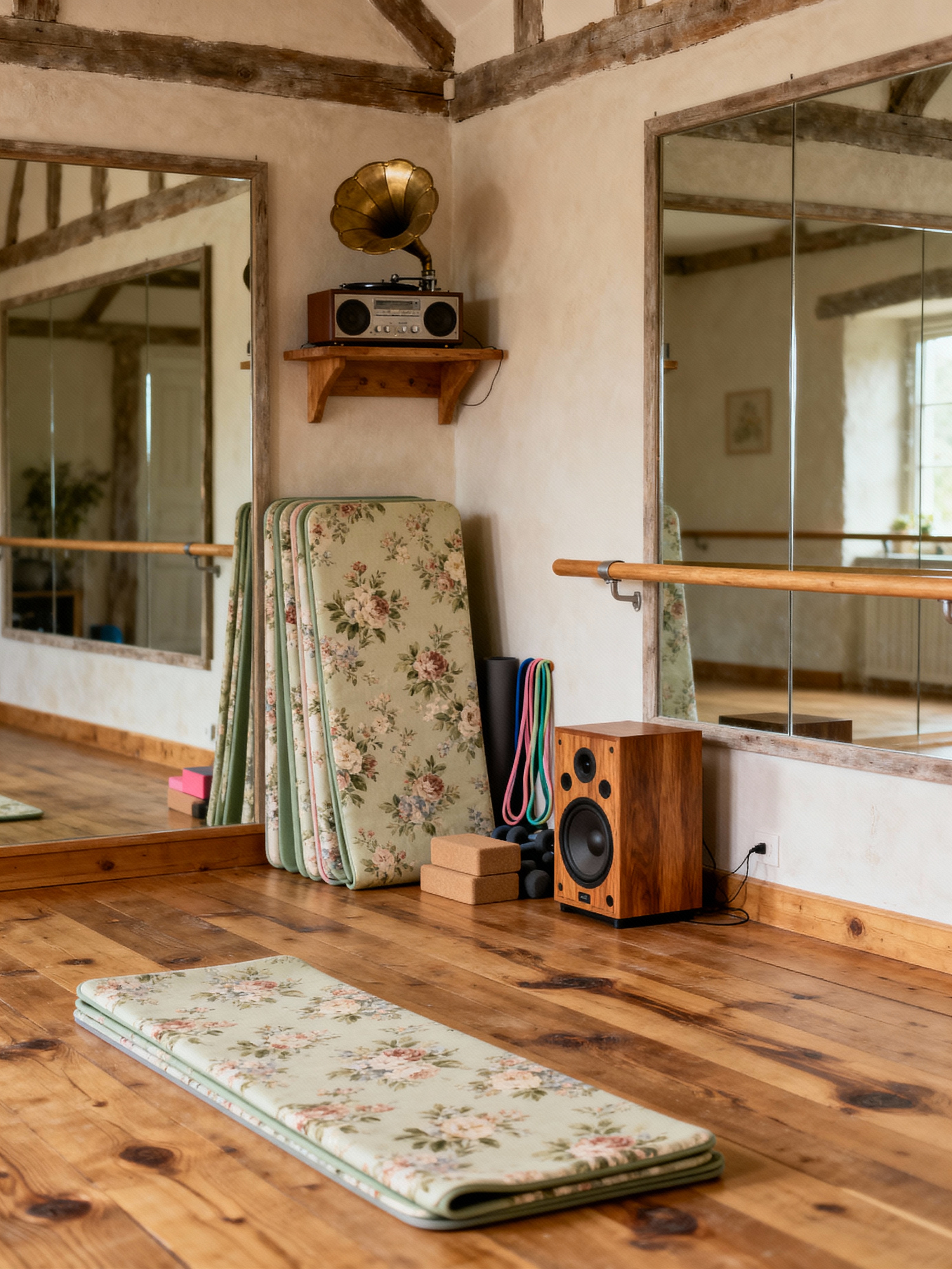 dance studio with cottagecore style with wooden floor and mirrors and dance mats and speaker and music player and exercise equipment and sound system and ballet barre. . with rustic and cottage style and traditional and organic and natural and muted colors and country style and floral patterns