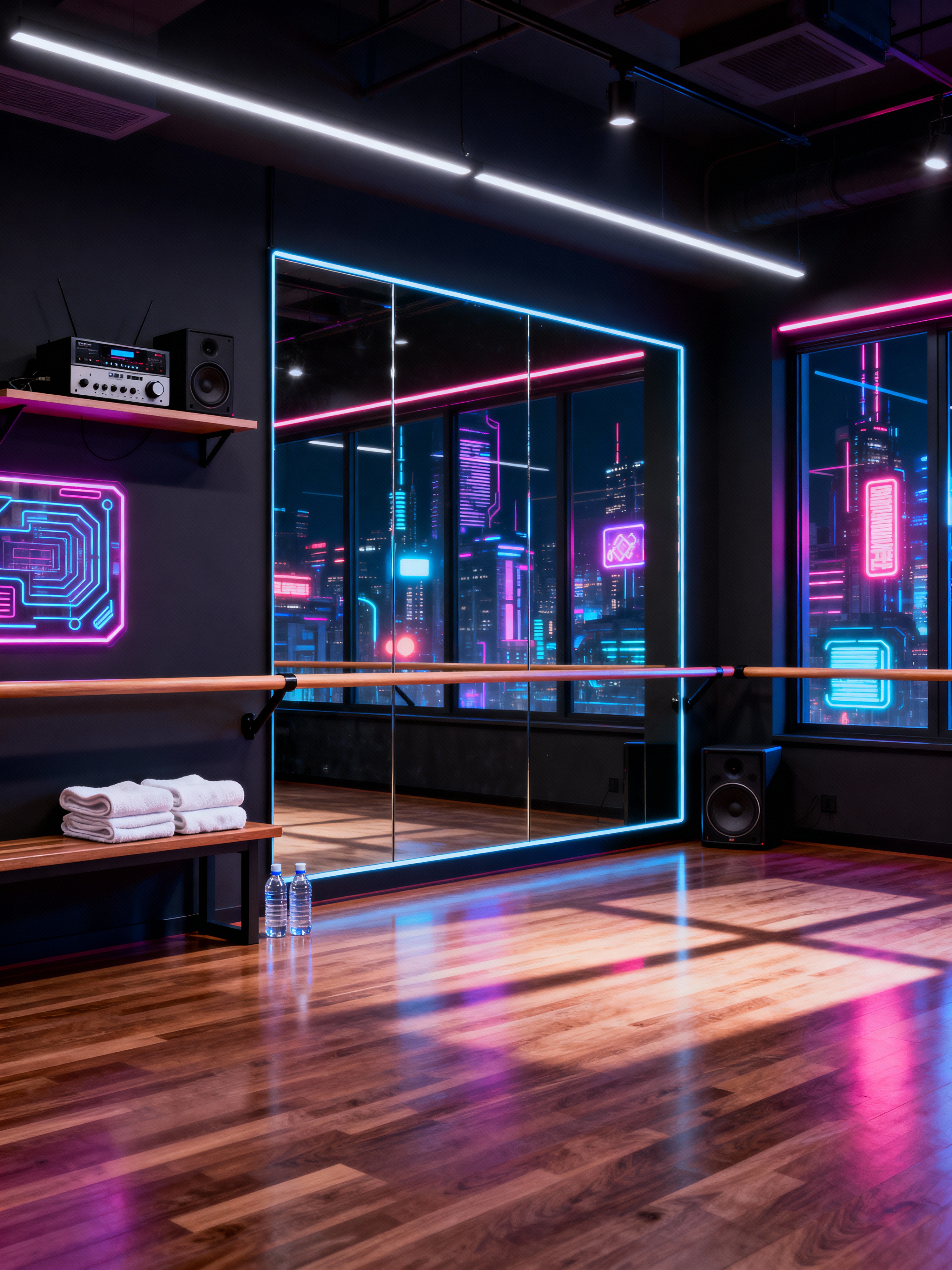 dance studio with cyberpunk style with wooden floor and towels and sound system and music player and water bottles and ballet barre and speaker and mirrors. . with futuristic cybernetic city and dark night and cyberpunk lights and color lights glow and bladerunner lights and minimalist and led lights and futuristic cybernetic details