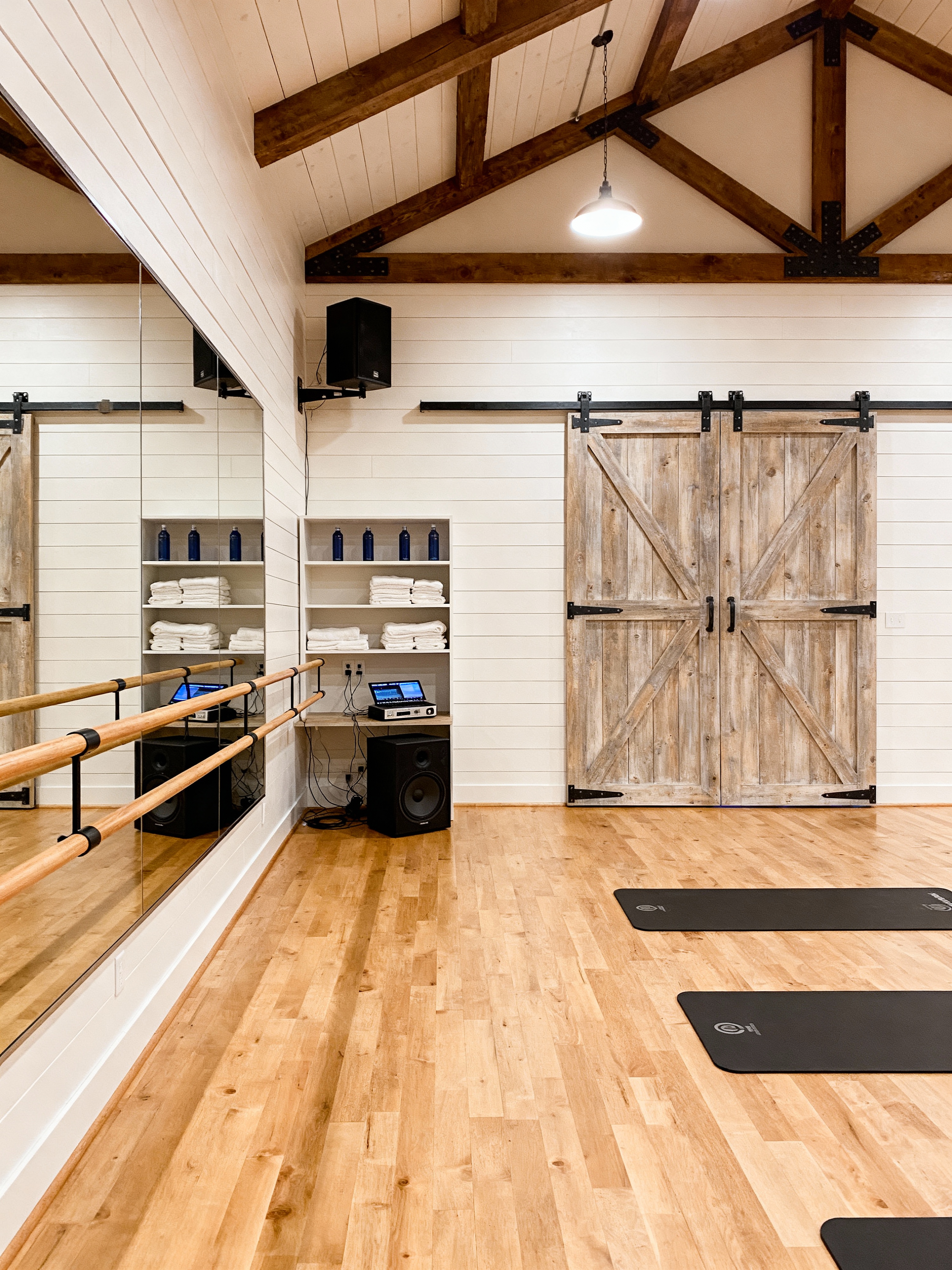 dance studio with farmhouse style with music player and wooden floor and speaker and ballet barre and towels and sound system and dance mats and water bottles. . with exposed wood and open shelving and barn doors and industrial accents and shiplap walls and country style and natural textures and rustic charm