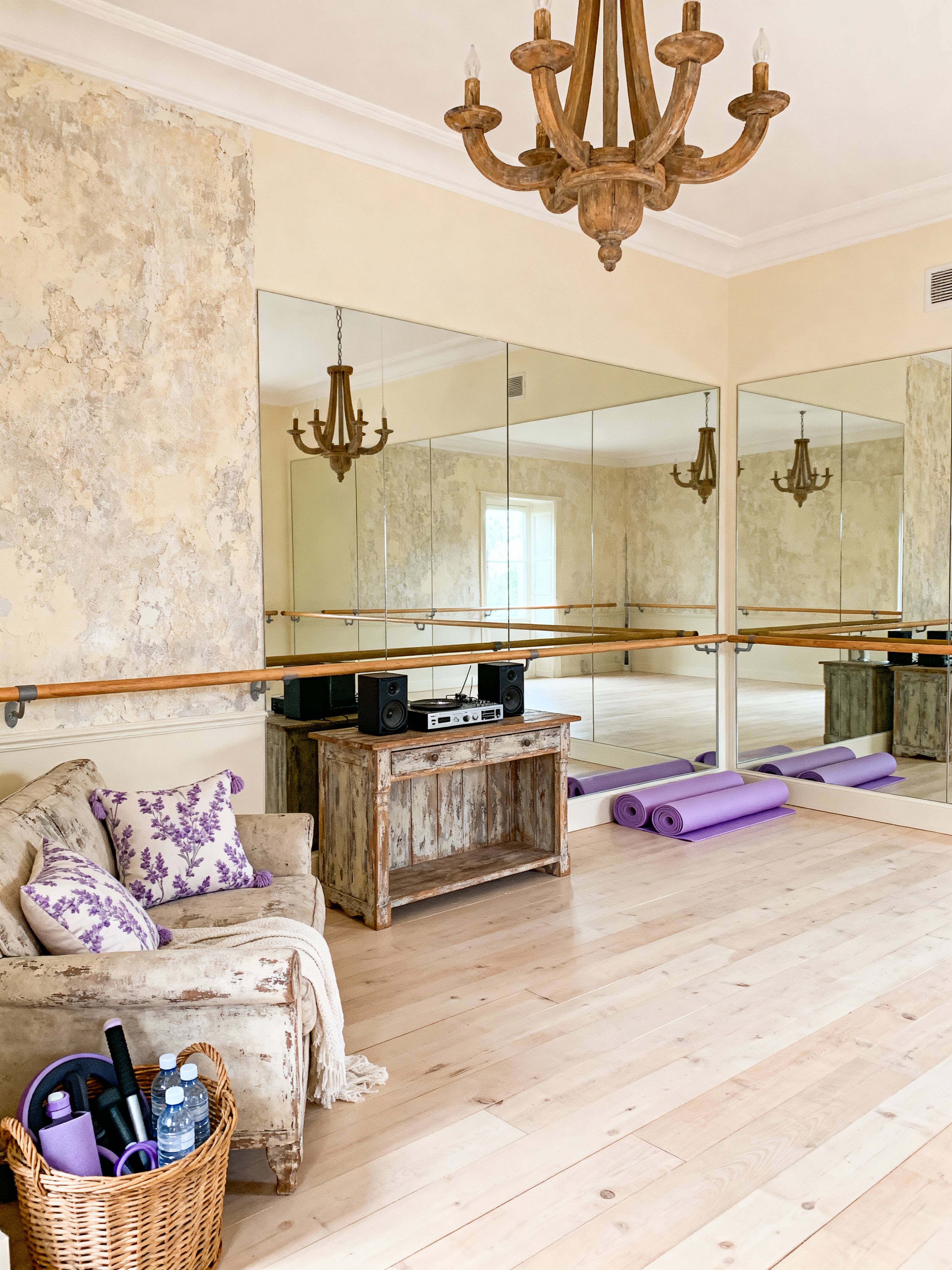 dance studio with french country style with dance mats and music player and ballet barre and sound system and mirrors and water bottles and exercise equipment and wooden floor. . with lavender accents and chandeliers and distressed wood and soft fabrics and elegant rustic and textured walls and vintage furniture and warm tones