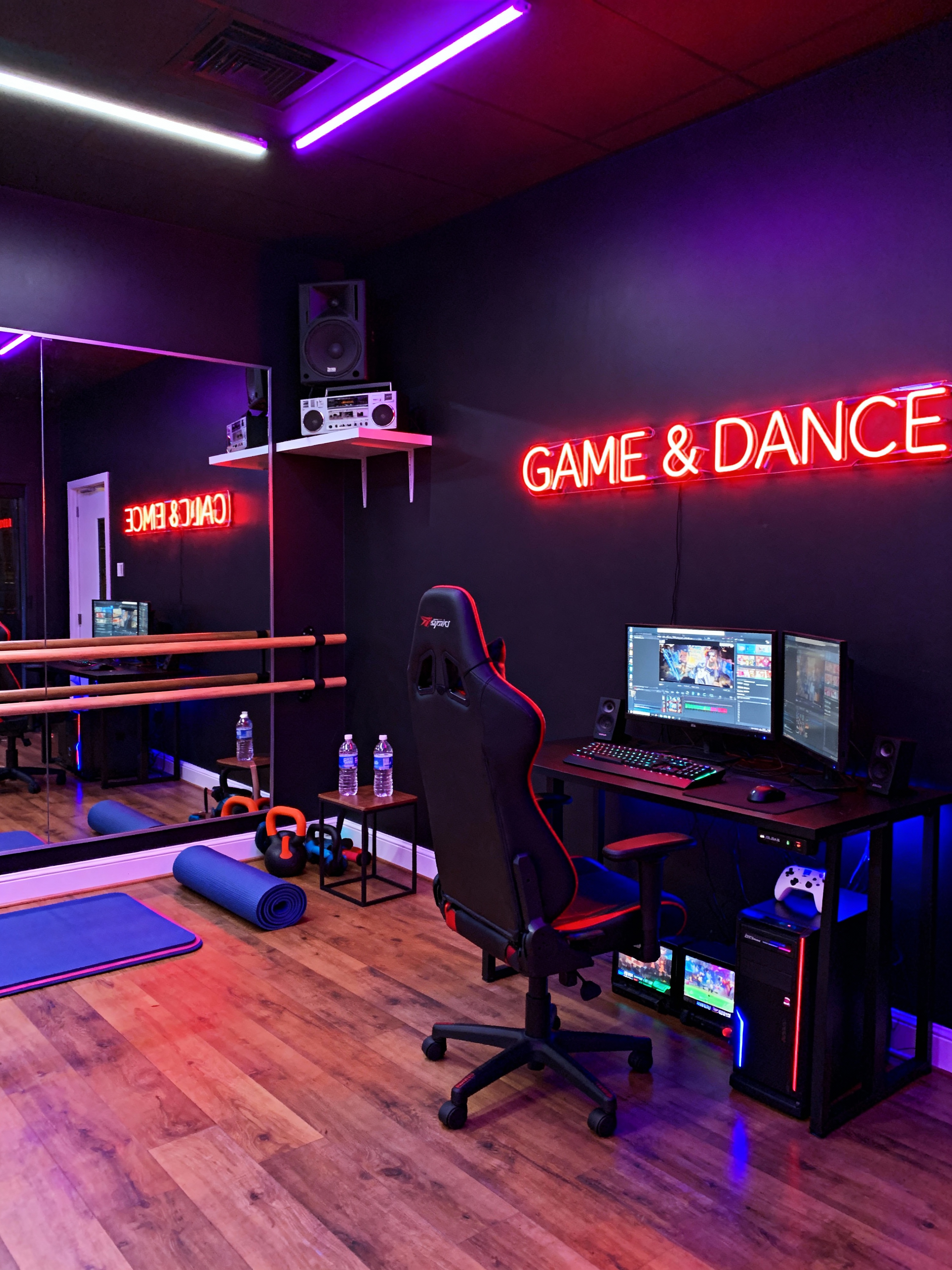 dance studio with gaming room style with water bottles and wooden floor and exercise equipment and dance mats and music player and ballet barre and speaker and mirrors. . with computer desk with computer displays and keyboard and neon letters on wall and gaming chair and dark walls and dark room and video game consoles and at night and purple and red lights