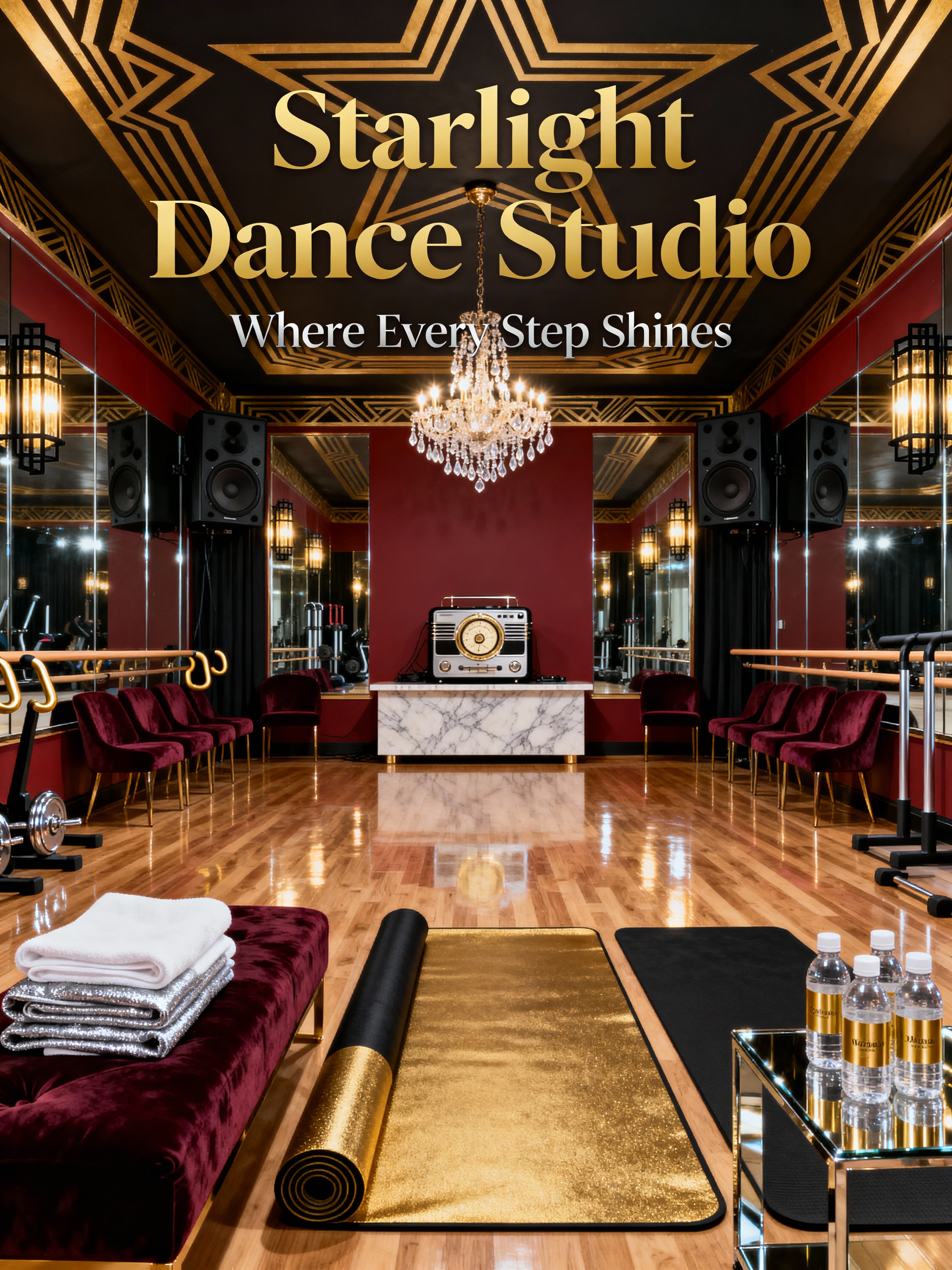 dance studio with hollywood glam style with sound system and music player and dance mats and towels and speaker and wooden floor and exercise equipment and water bottles. . with star quality and mirrored surfaces and dramatic lighting and glamorous style and velvet upholstery and art deco influence and opulent details and metallic accents