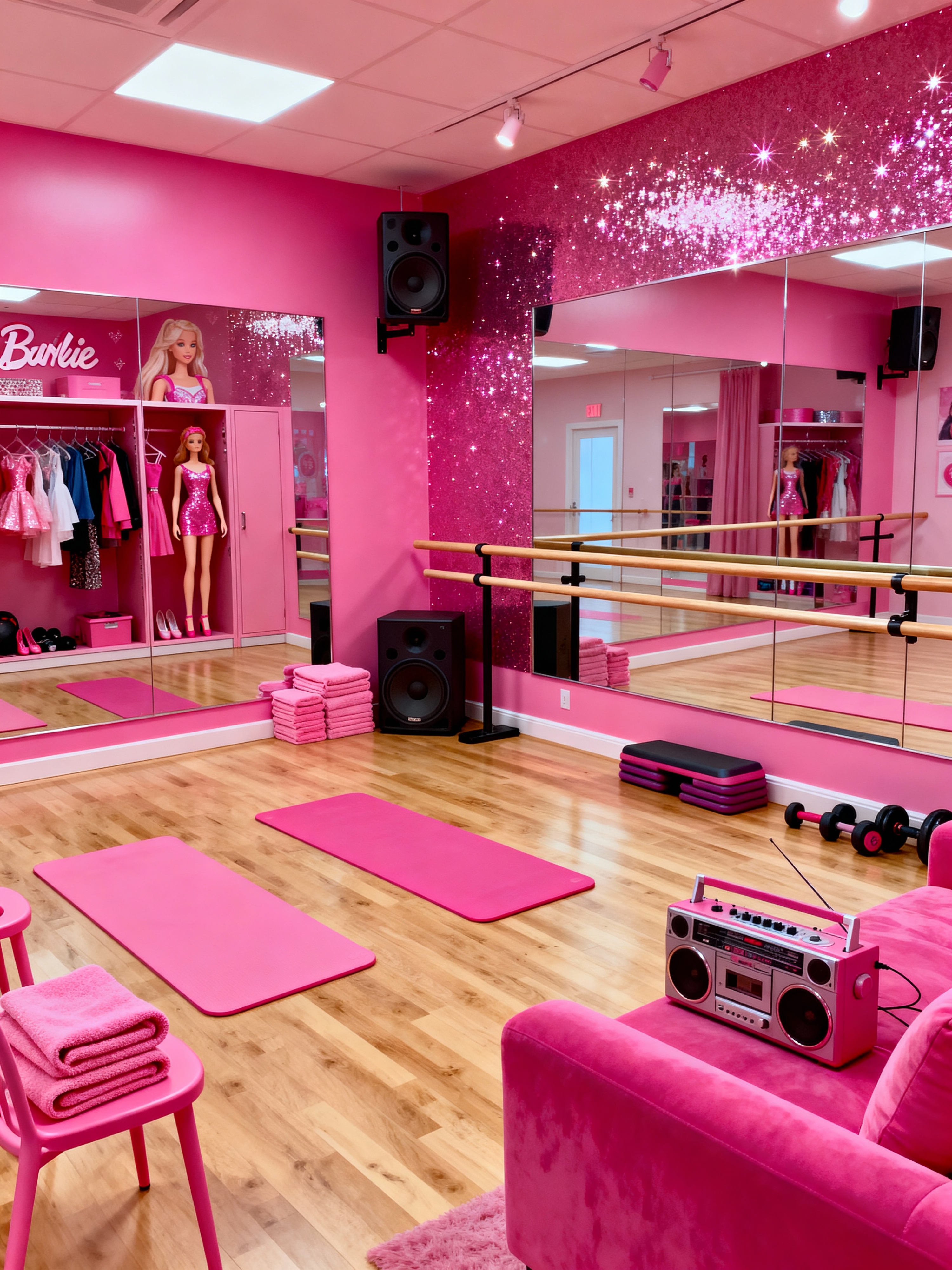 dance studio with hot pink style with speaker and exercise equipment and ballet barre and mirrors and towels and wooden floor and dance mats and music player. . with barbie style interior and hot pink barbie walls and hot pink barbie colors and barbie closet and barbie glitter and sparkle and barbie bold rosy hues like fuchsia and magenta and barbie chairs and barbie sofa