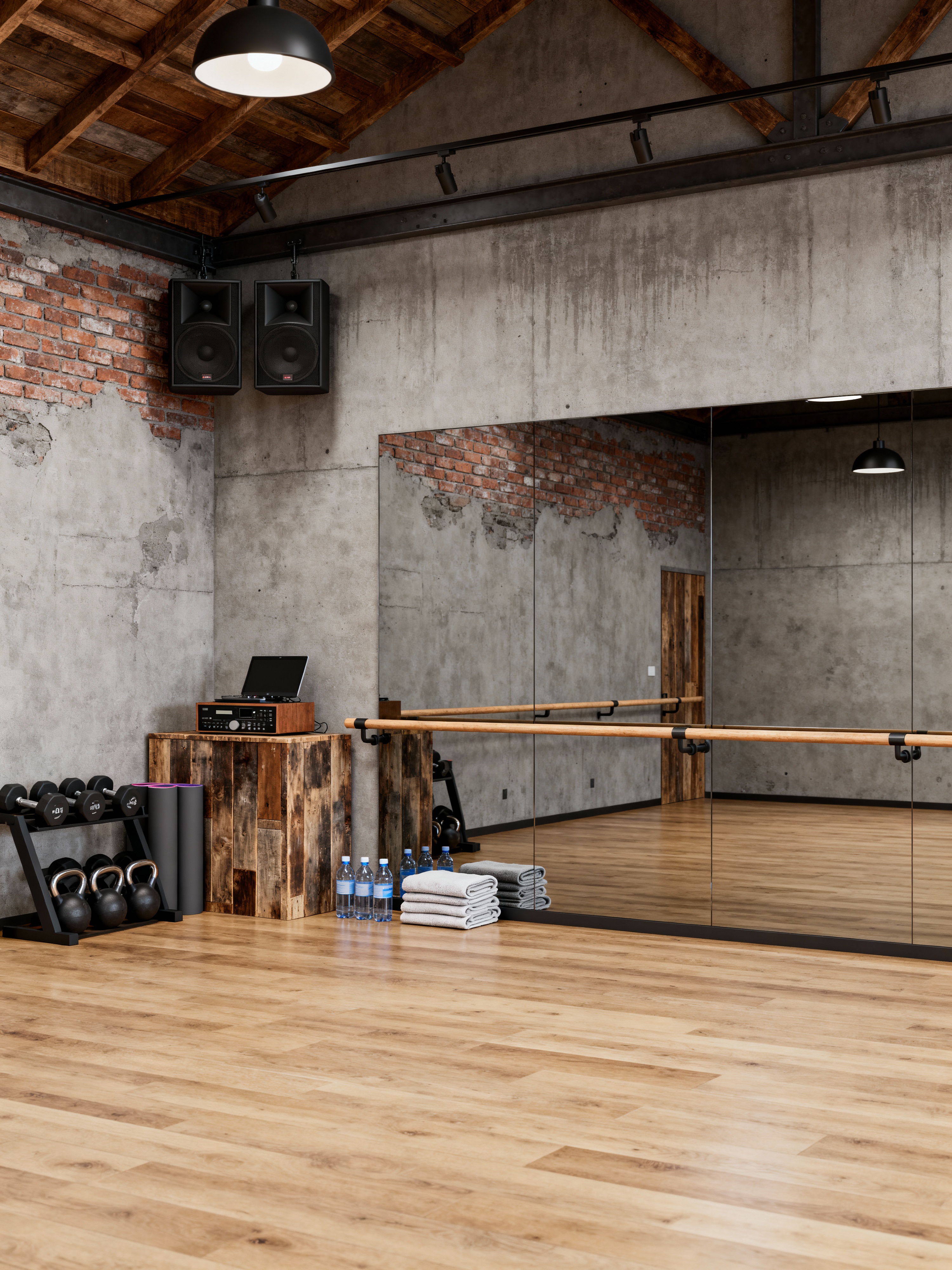 dance studio with industrial style with towels and wooden floor and water bottles and exercise equipment and sound system and mirrors and music player and ballet barre. . with exposed concrete and raw aesthetic and utilitarian objects and reclaimed wood and factory style and exposed brick and exposed rafters and open floorplan