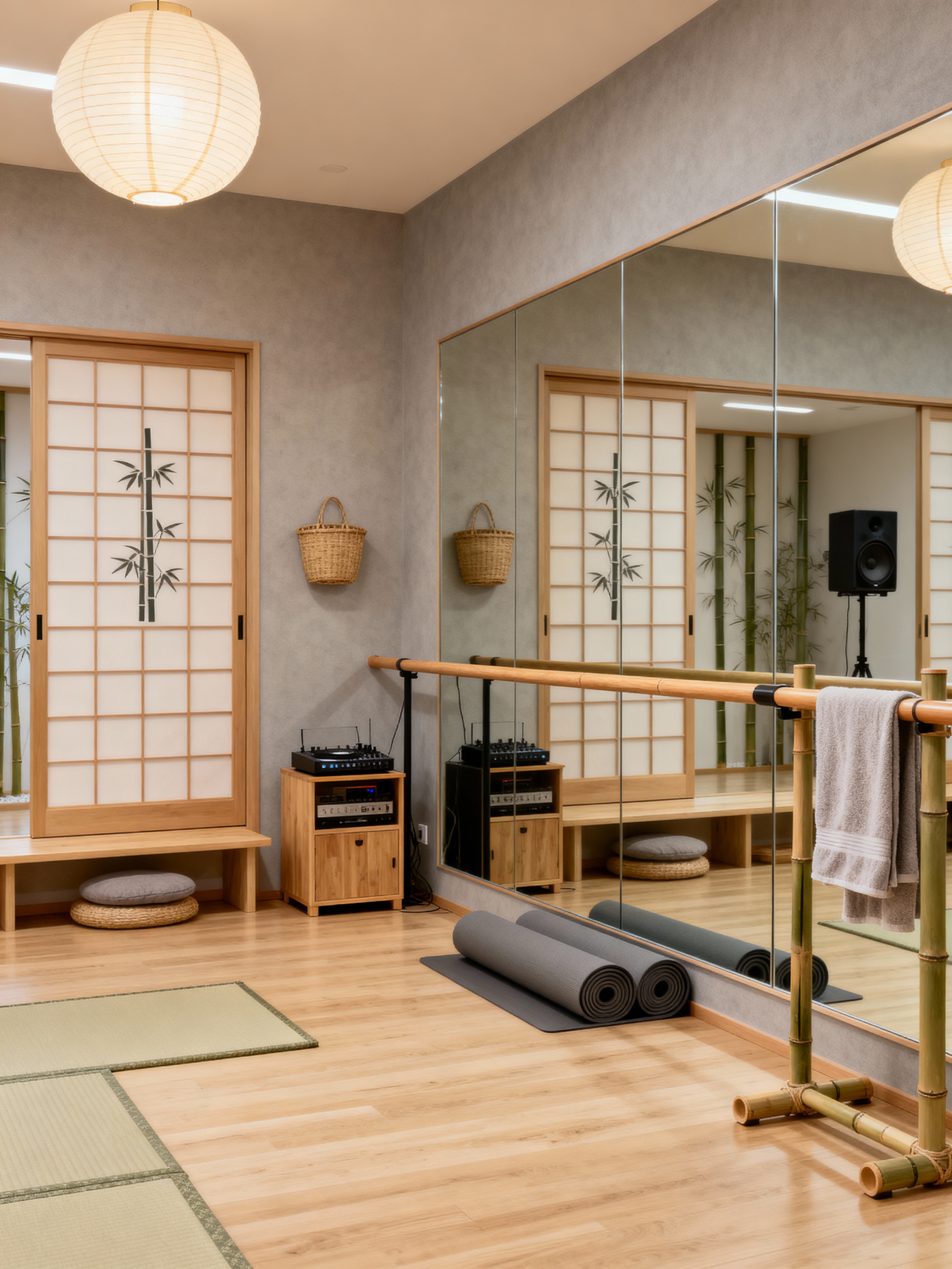 dance studio with japanese design style with wooden floor and music player and dance mats and sound system and speaker and ballet barre and mirrors and towels. . with bamboo accents and neutral colors and low furniture and sliding doors and natural materials and tranquility and zen decor and tatami mats