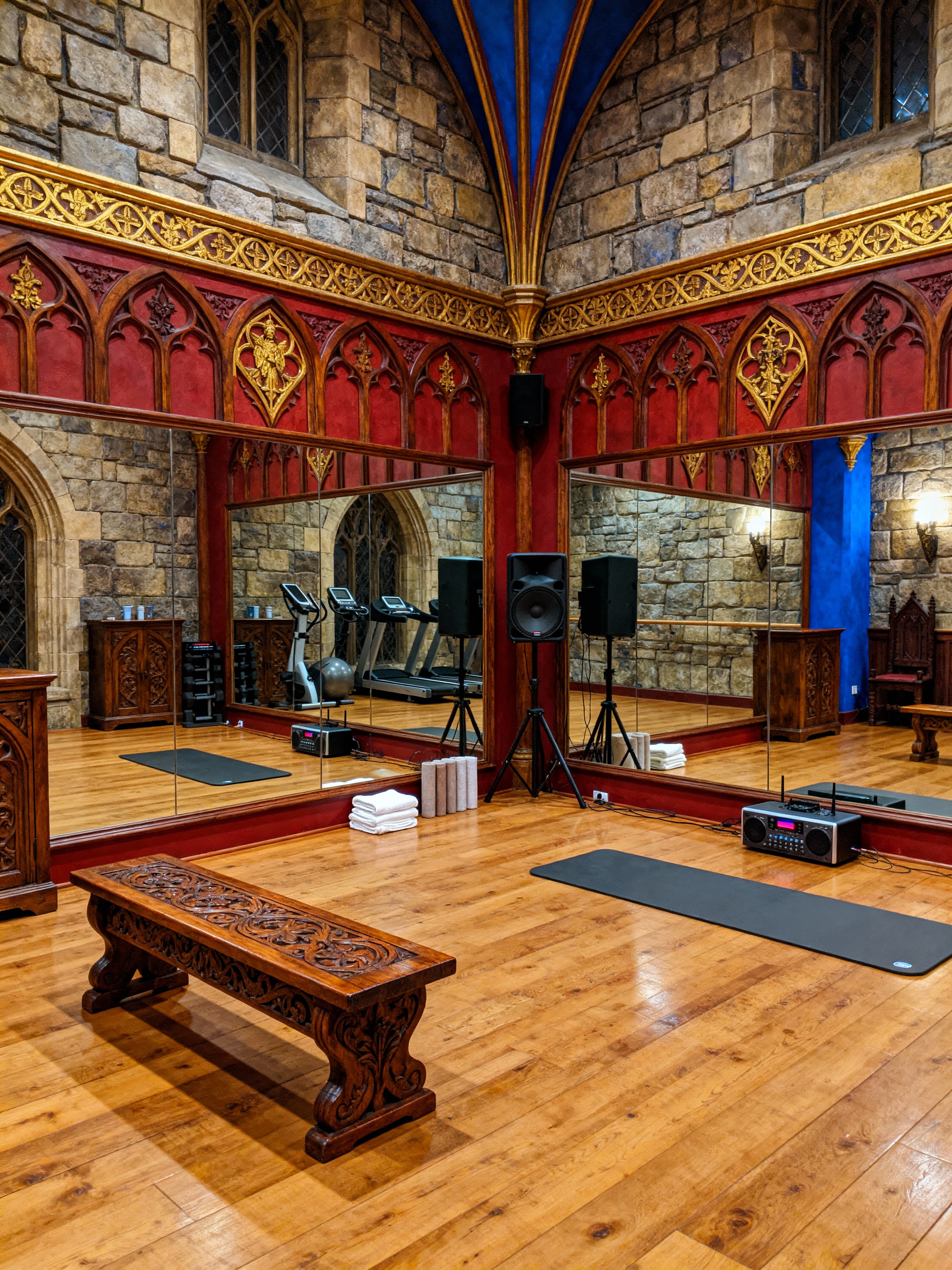 dance studio with medieval style with wooden floor and mirrors and exercise equipment and speaker and towels and sound system and dance mats and music player. . with castle interior and castle interior and gothic appearance and heavy furniture pieces and stone walls and intricate wooden inlay designs and carvings and carved wooden benches and deep colors like red, gold, or blue