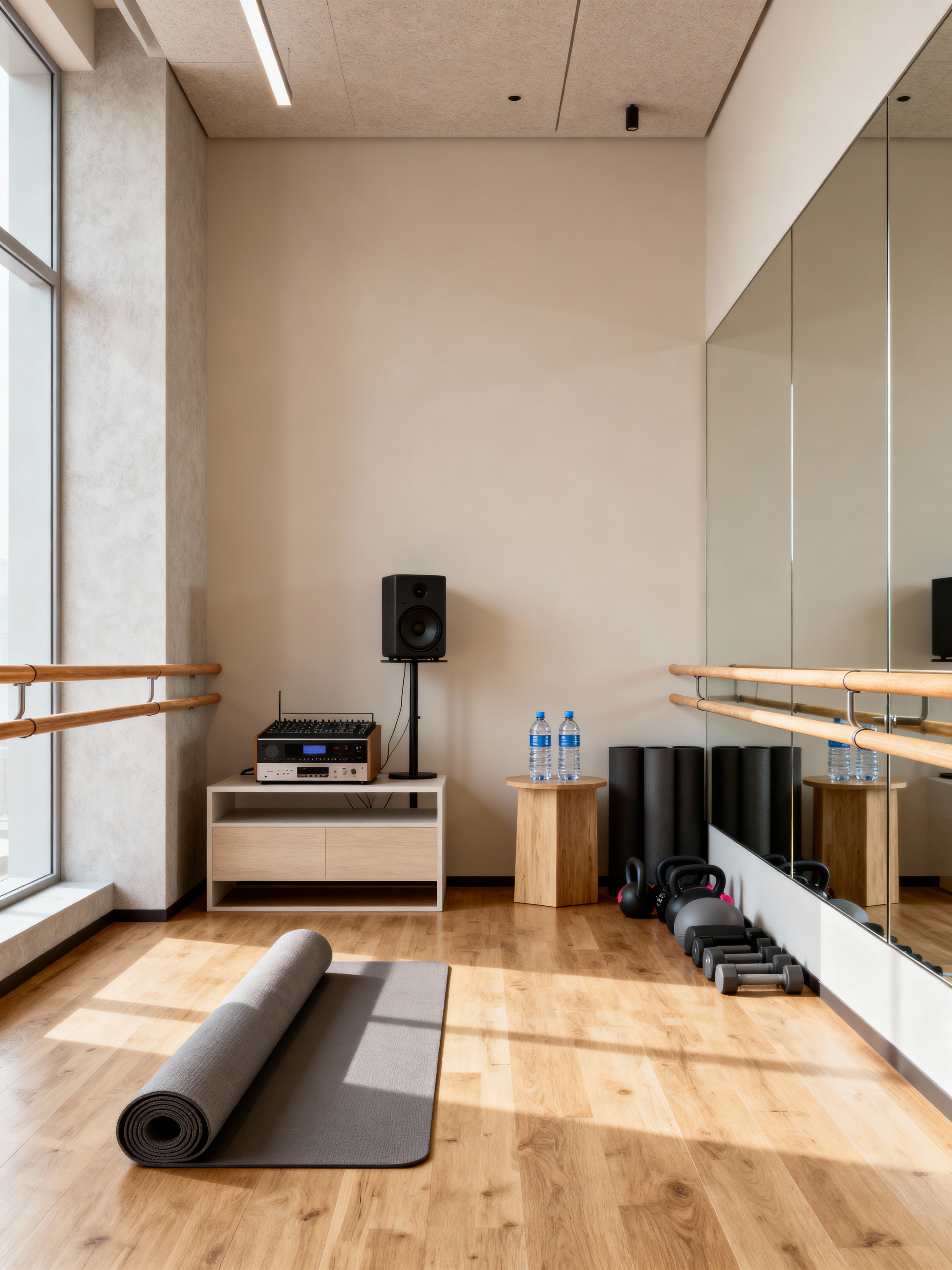 dance studio with modern style with ballet barre and music player and dance mats and wooden floor and water bottles and speaker and mirrors and exercise equipment. . with natural materials and elements and open and natural lighting and practicality and functionality and simple, clean lines and simplistic furniture and neutral walls and textures and natural materials and elements