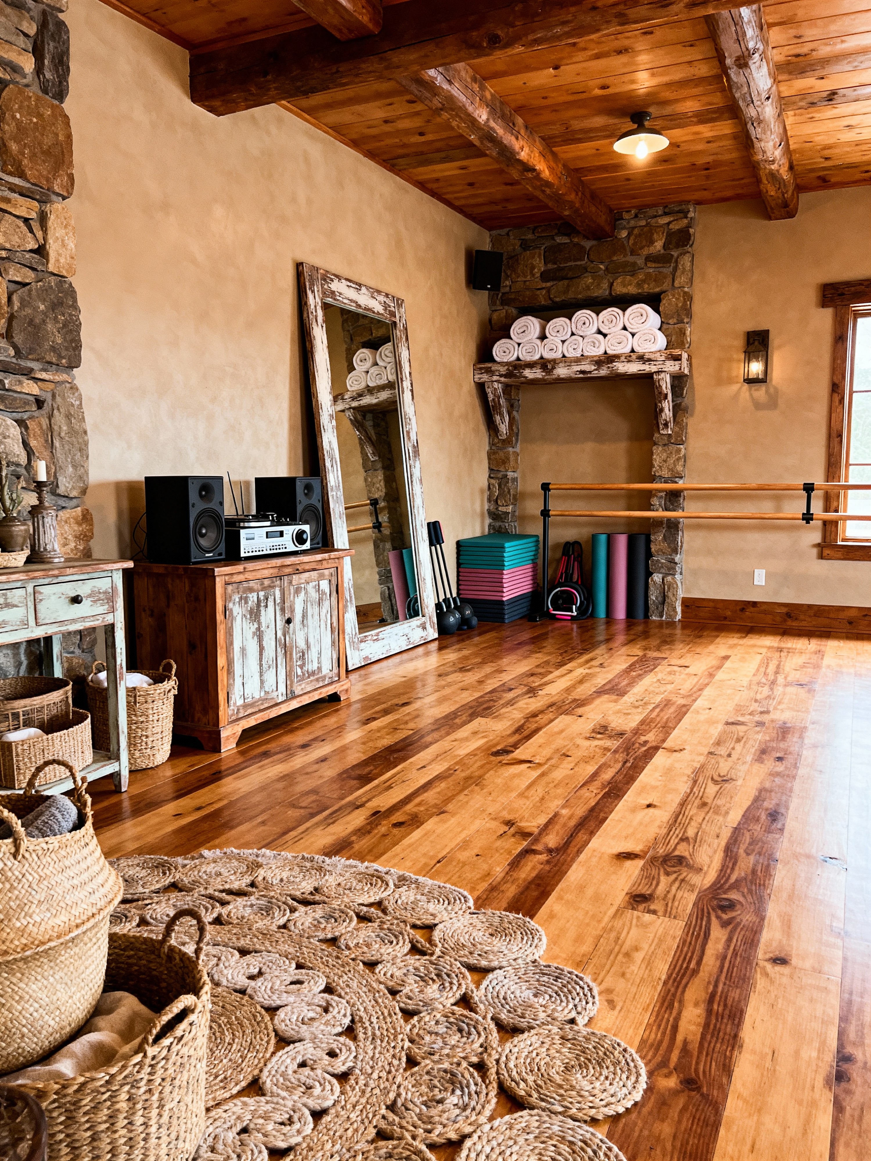dance studio with rustic style with wooden floor and music player and mirrors and exercise equipment and sound system and ballet barre and dance mats and towels. . with vintage decor and warmth and country style and cozy cabin and exposed beams and stone accents and distressed finishes and woven textures