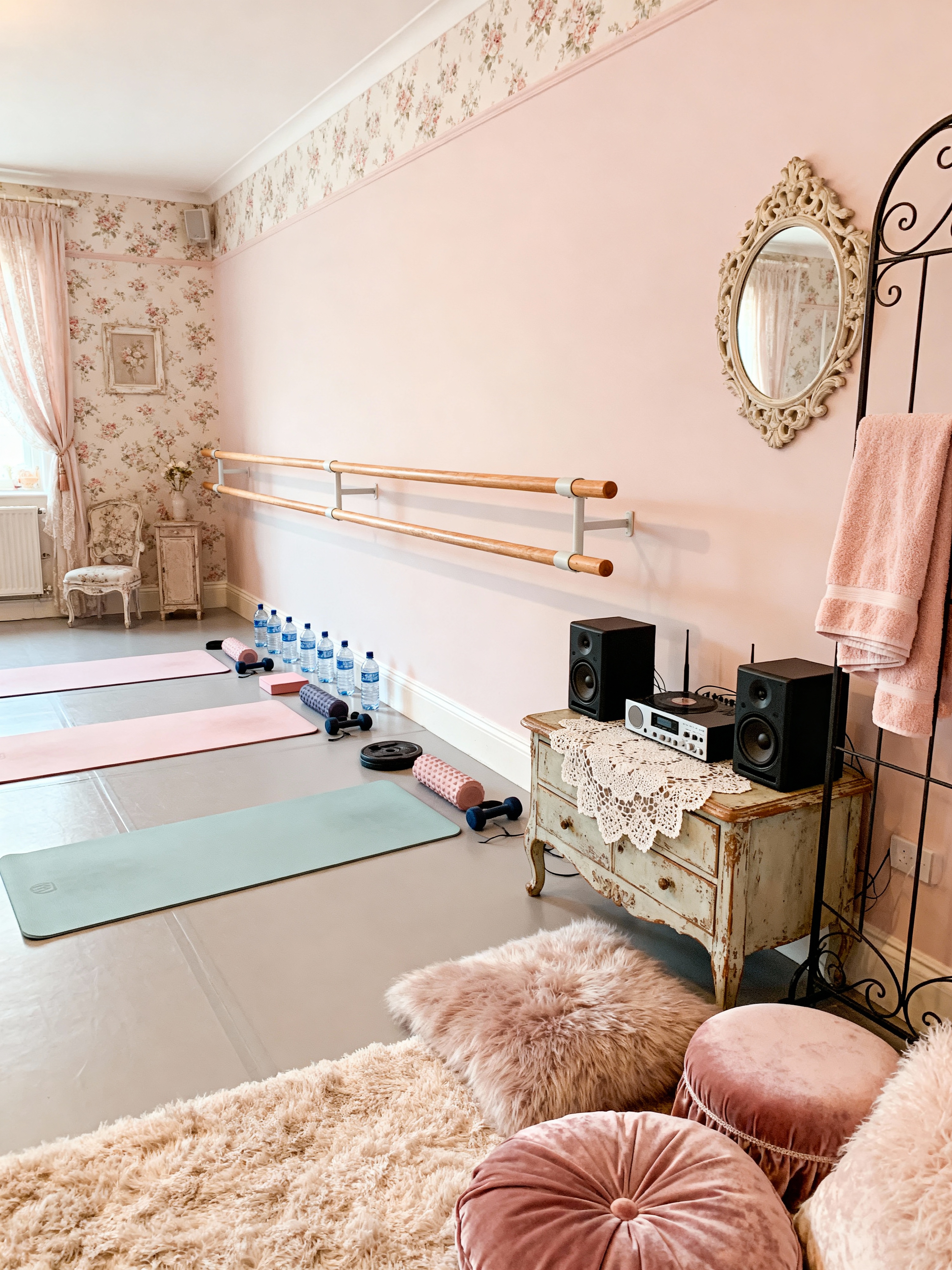 dance studio with shabby chic style with water bottles and music player and sound system and ballet barre and towels and speaker and dance mats and exercise equipment. . with feminine touches and antique lace and cottage feel and vintage charm and delicate details and soft textures and romantic style and distressed furniture