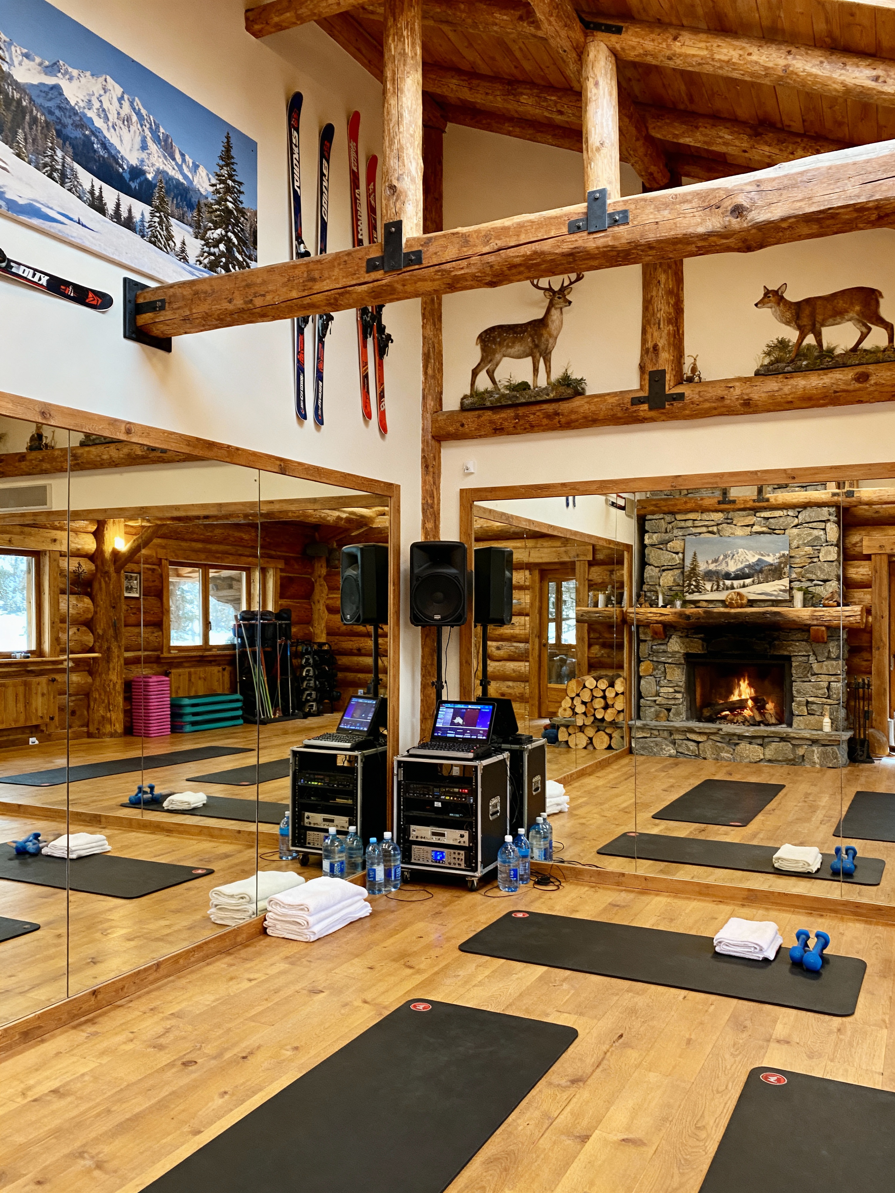 dance studio with ski chalet style with towels and mirrors and music player and dance mats and water bottles and exercise equipment and sound system and speaker. . with stone fireplace and wood beams and exposed construction beams and nature-inspired and ski-themed decor and animal motifs and mountain-inspired and wooden logs