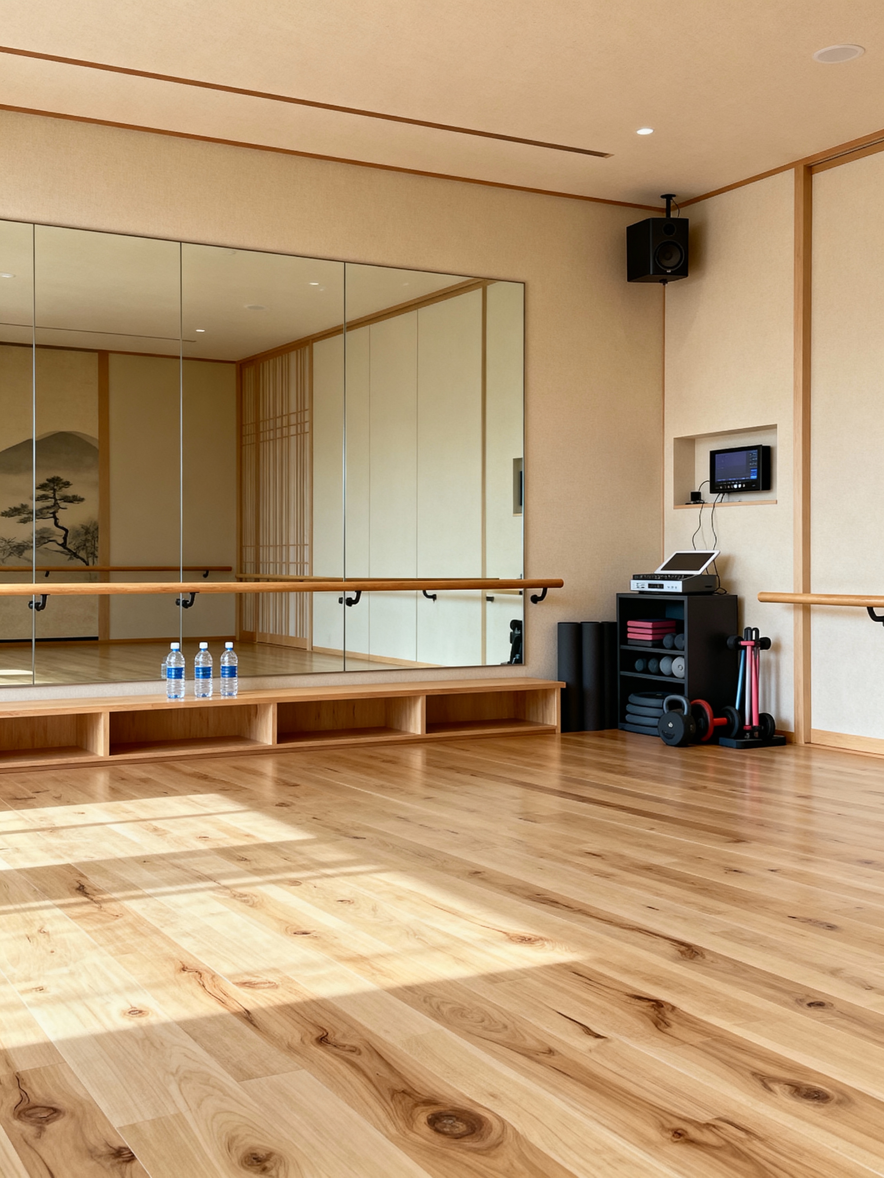 dance studio with zen style with mirrors and sound system and wooden floor and water bottles and exercise equipment and music player and ballet barre and speaker. . with asian zen interior and japanese minimalist interior and asian zen interior and clutter free and simple furniture and serenity and harmony and natural textures and simplicity