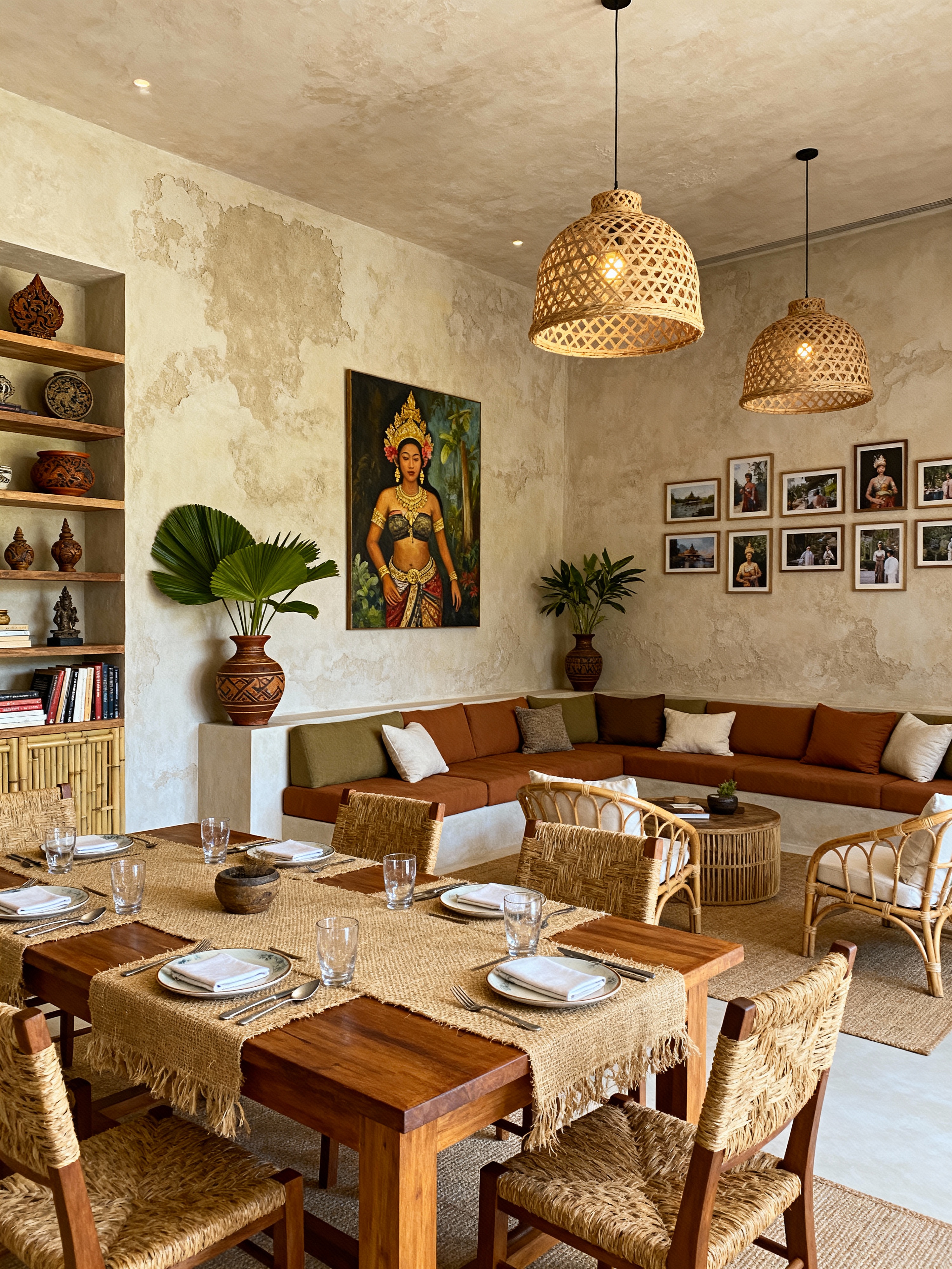 dining room with bali style with light or chandelier and plates, cutlery and glasses on dining table and dining table and table cloth and painting or photo on wall and plant and dining table chairs and bookshelves. . with handcrafted pottery and vases and raffia or bamboo accents and low modular sofas and textured plaster or stucco finish and woven pendant lamps and warm ambient lighting and conversation pit with pillows and rattan chairs and decor