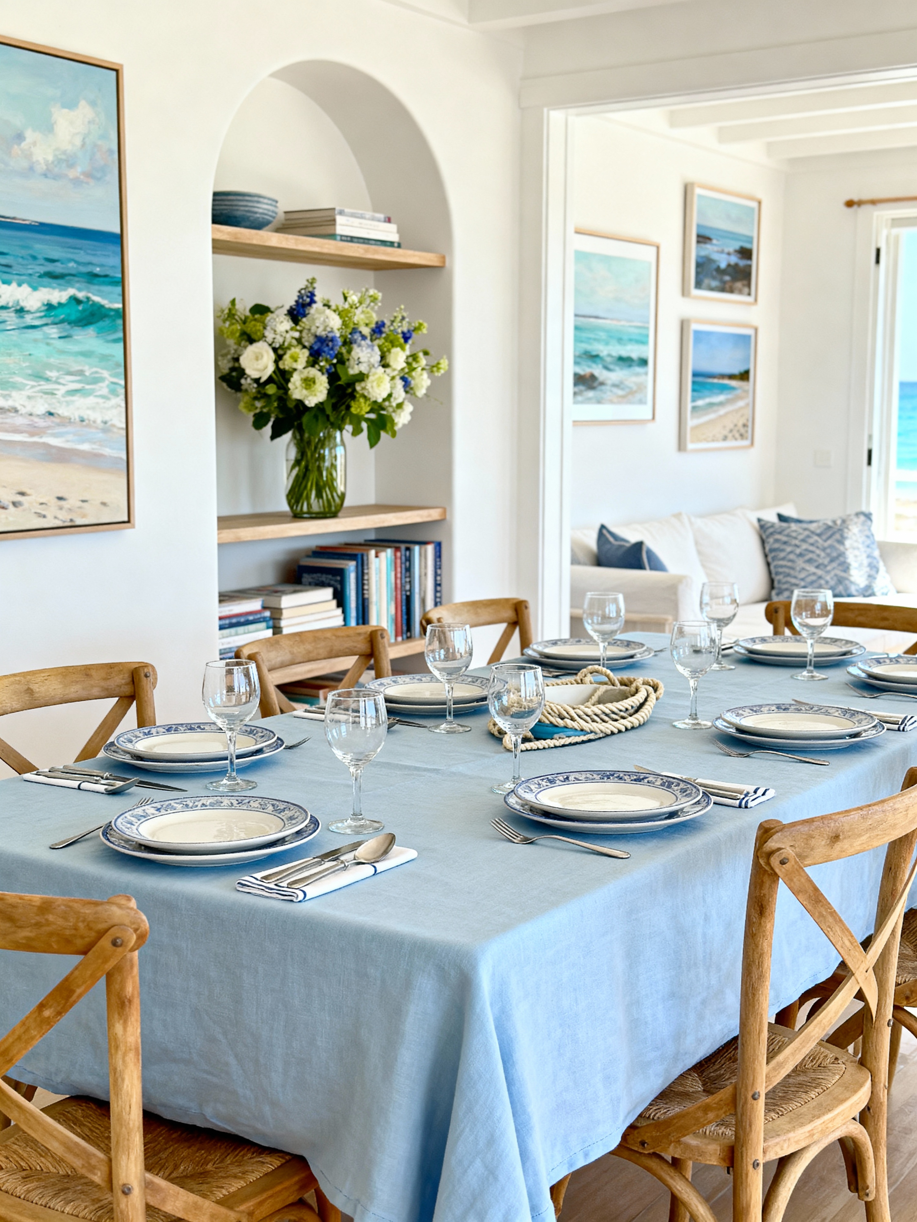 dining room with coastal style with plant and painting or photo on wall and plates, cutlery and glasses on dining table and bookshelves and vase and table cloth and dining table and dining table chairs. . with natural materials and relaxed style and airy feel and beach vibes and seaside colors and nautical decor and light blue and ocean-inspired