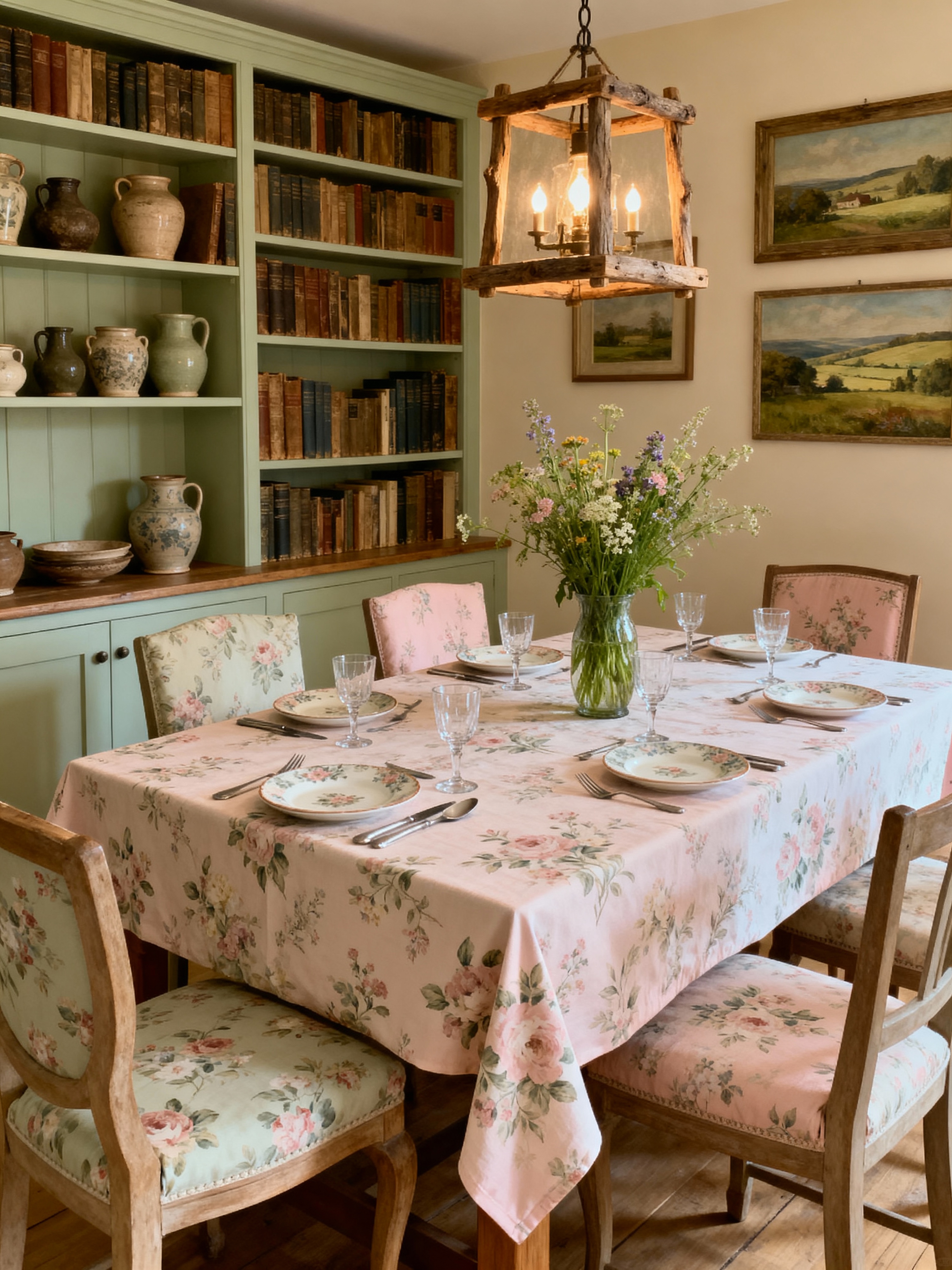 dining room with cottagecore style with painting or photo on wall and plates, cutlery and glasses on dining table and dining table and dining table chairs and vase and table cloth and bookshelves and light or chandelier. . with country style and floral patterns and organic and rustic and traditional and natural and muted colors and cottage style