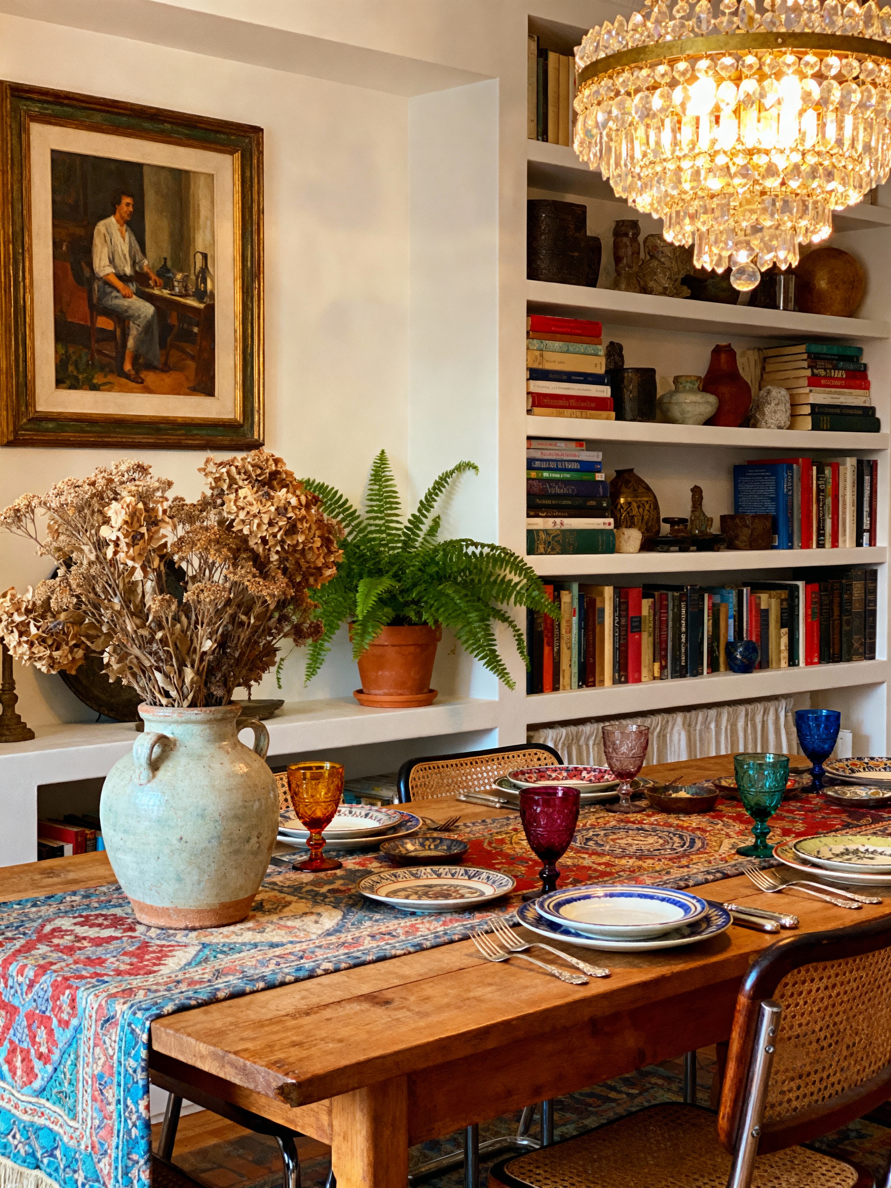 dining room with eclectic style with vase and table cloth and dining table and plant and bookshelves and painting or photo on wall and light or chandelier and plates, cutlery and glasses on dining table. . with vintage finds and layered textures and artistic flair and mixed styles and personal expression and colorful palette and unique pieces and global influences