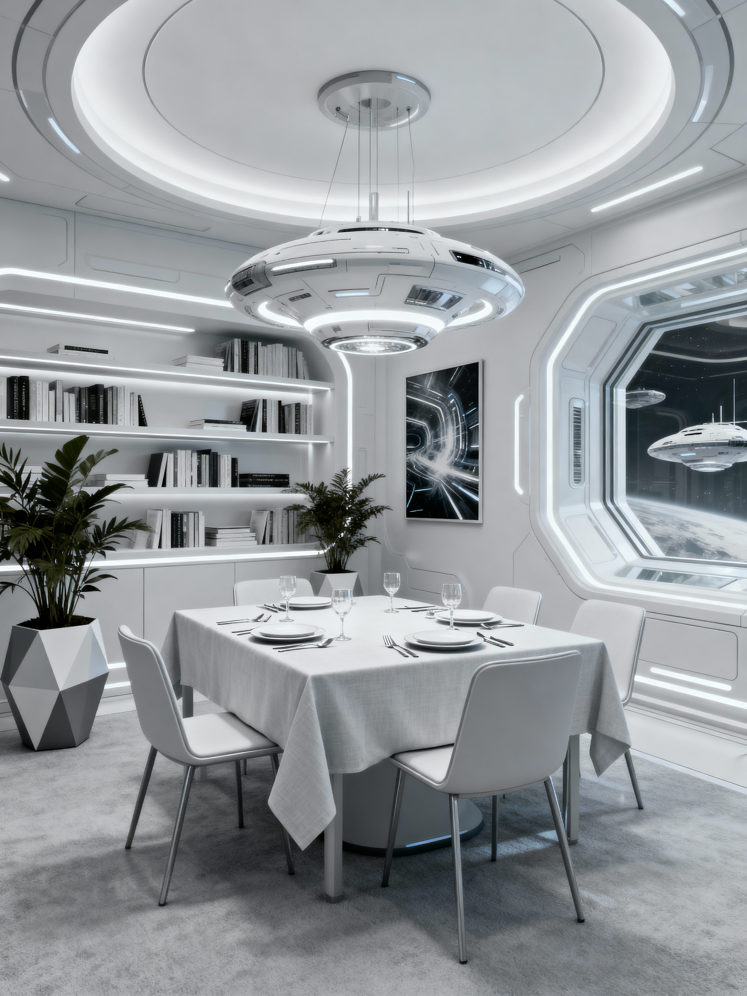 dining room with futuristic style with table cloth and dining table and dining table chairs and bookshelves and light or chandelier and plant and painting or photo on wall and plates, cutlery and glasses on dining table. . with circular shapes and spaceship interior and monochromatic palette and floating surfaces and glass panes and futurism and futuristic interior and light colors