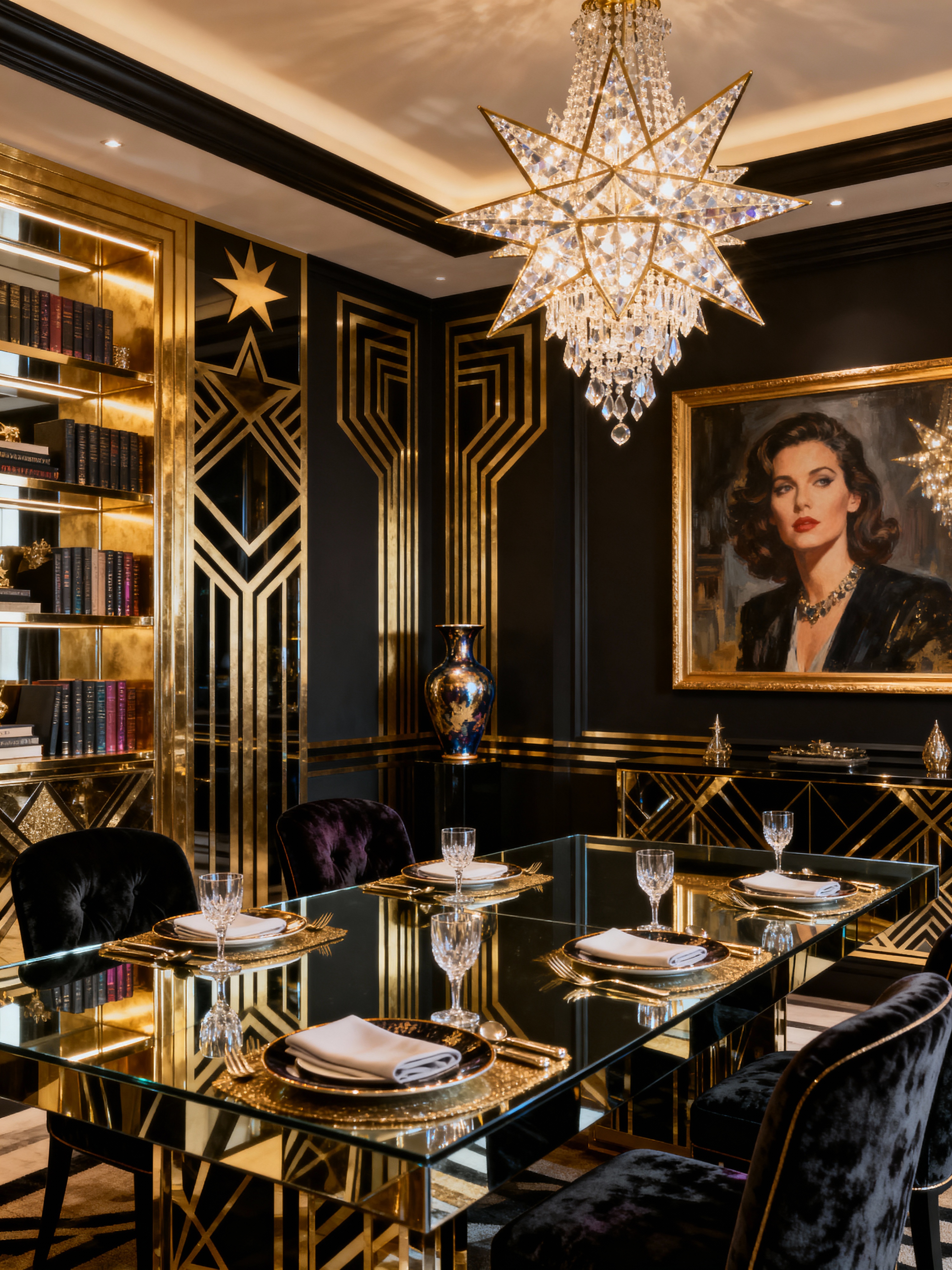 dining room with hollywood glam style with plates, cutlery and glasses on dining table and dining table and dining table chairs and bookshelves and painting or photo on wall and table cloth and light or chandelier and vase. . with dramatic lighting and crystal chandeliers and glamorous style and opulent details and star quality and art deco influence and velvet upholstery and mirrored surfaces