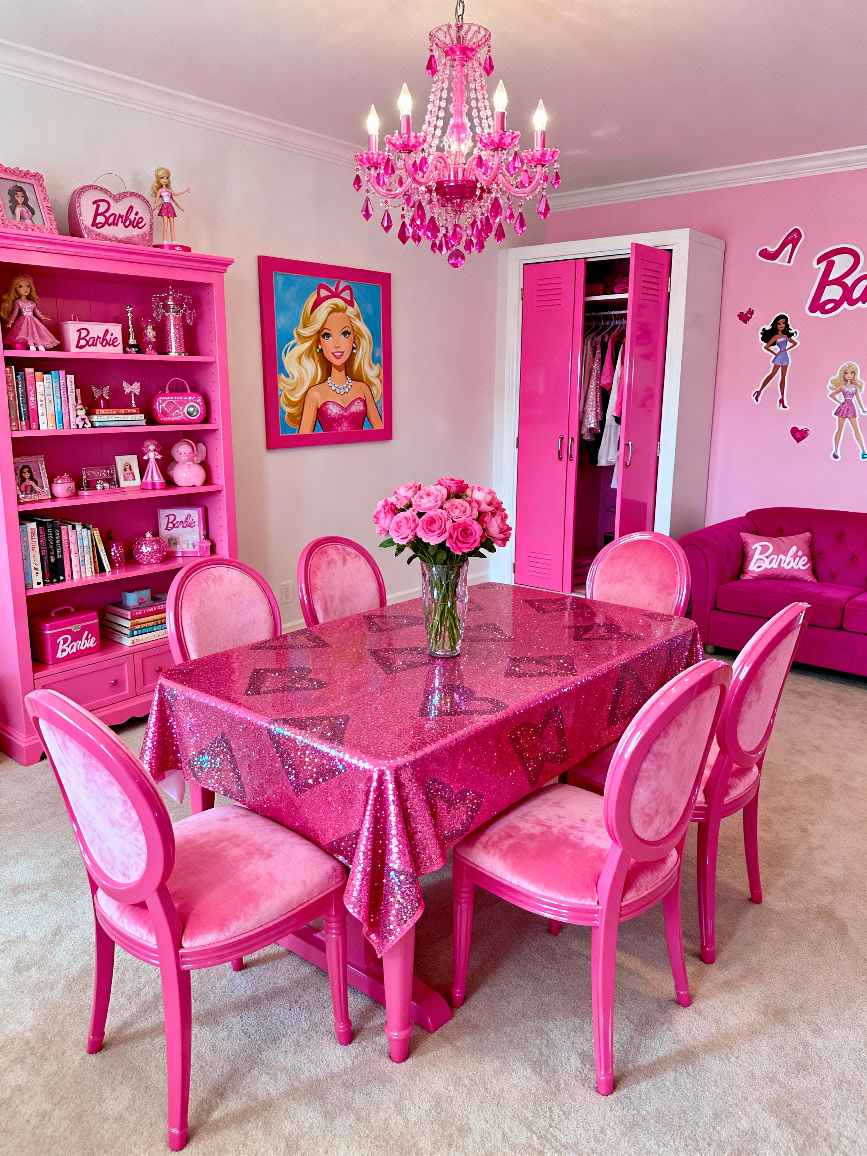 dining room with hot pink style with dining table chairs and bookshelves and vase and dining table and plant and table cloth and painting or photo on wall and light or chandelier. . with barbie closet and barbie sofa and barbie bold rosy hues like fuchsia and magenta and hot pink barbie walls and hot pink barbie colors and barbie style interior and barbie plastic interior and barbie glitter and sparkle