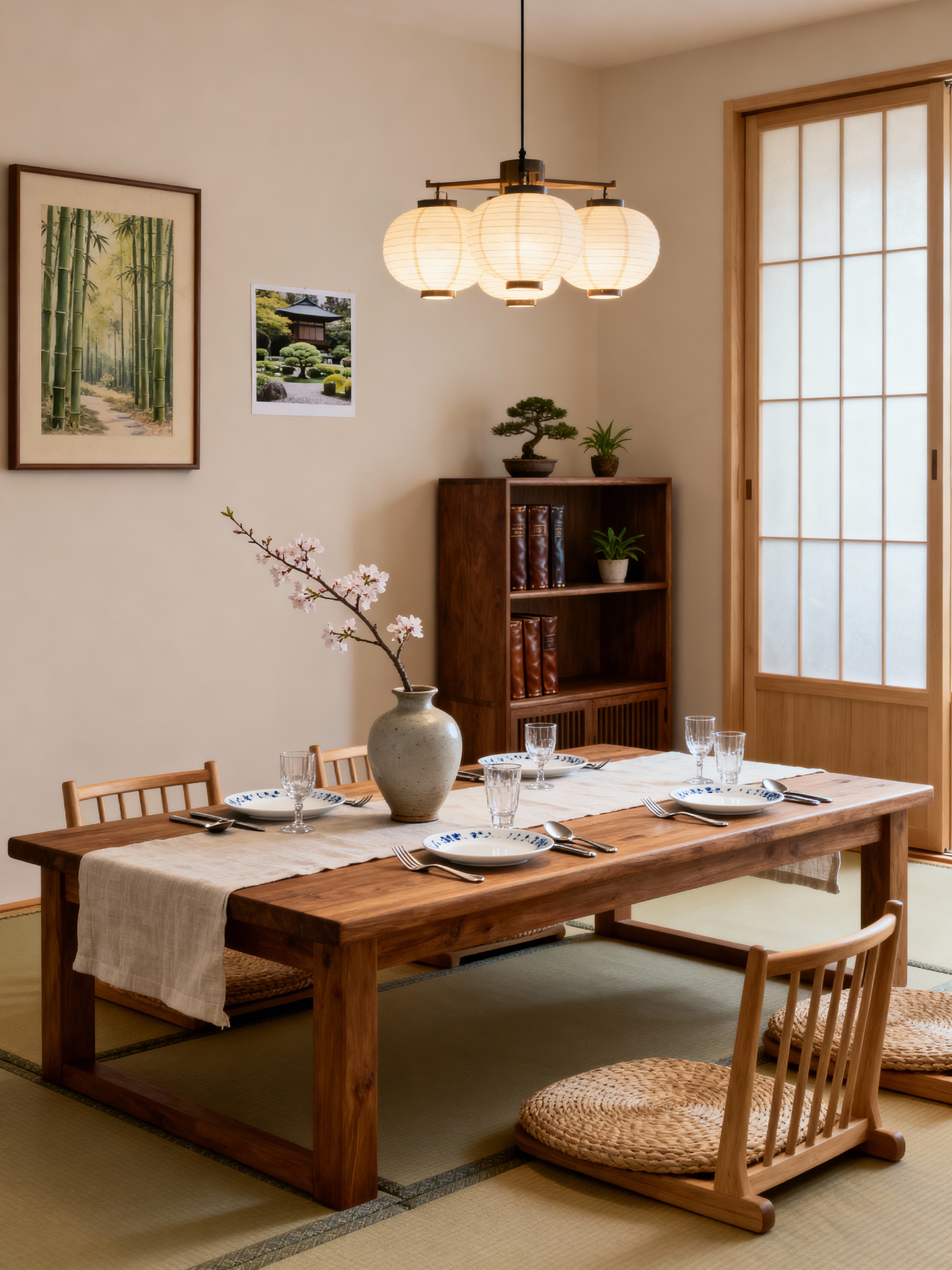 dining room with japanese design style with table cloth and vase and plates, cutlery and glasses on dining table and light or chandelier and dining table chairs and dining table and painting or photo on wall and bookshelves. . with sliding doors and tranquility and wabi-sabi and natural materials and indoor plants and neutral colors and minimalism and tatami mats
