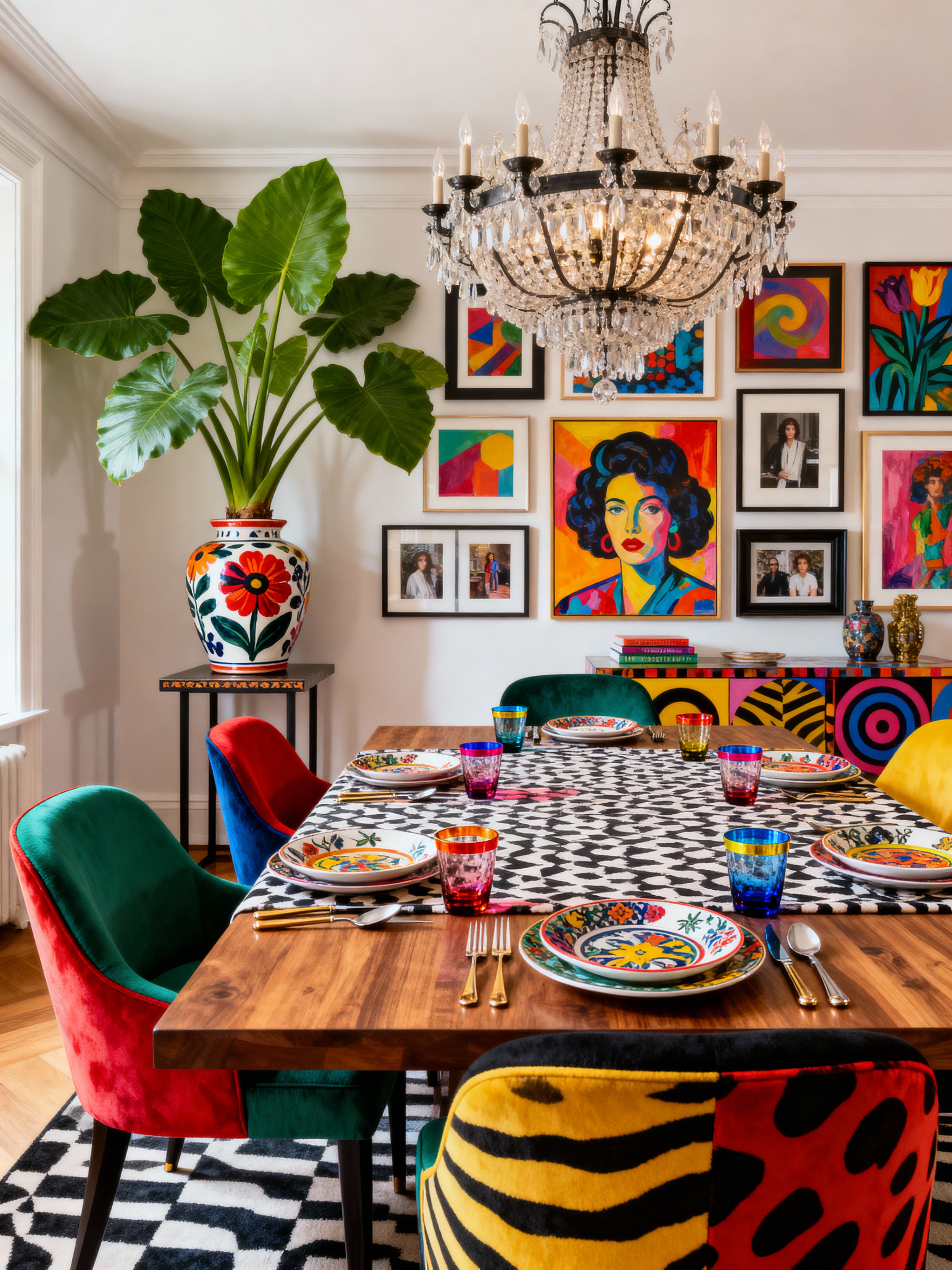 dining room with maximalist style with plant and light or chandelier and vase and painting or photo on wall and table cloth and plates, cutlery and glasses on dining table and dining table and dining table chairs. . with bold patterns and playful and eye-catching and vibrant and bold design and bold colors and bold creativity and over-the-top aesthetic