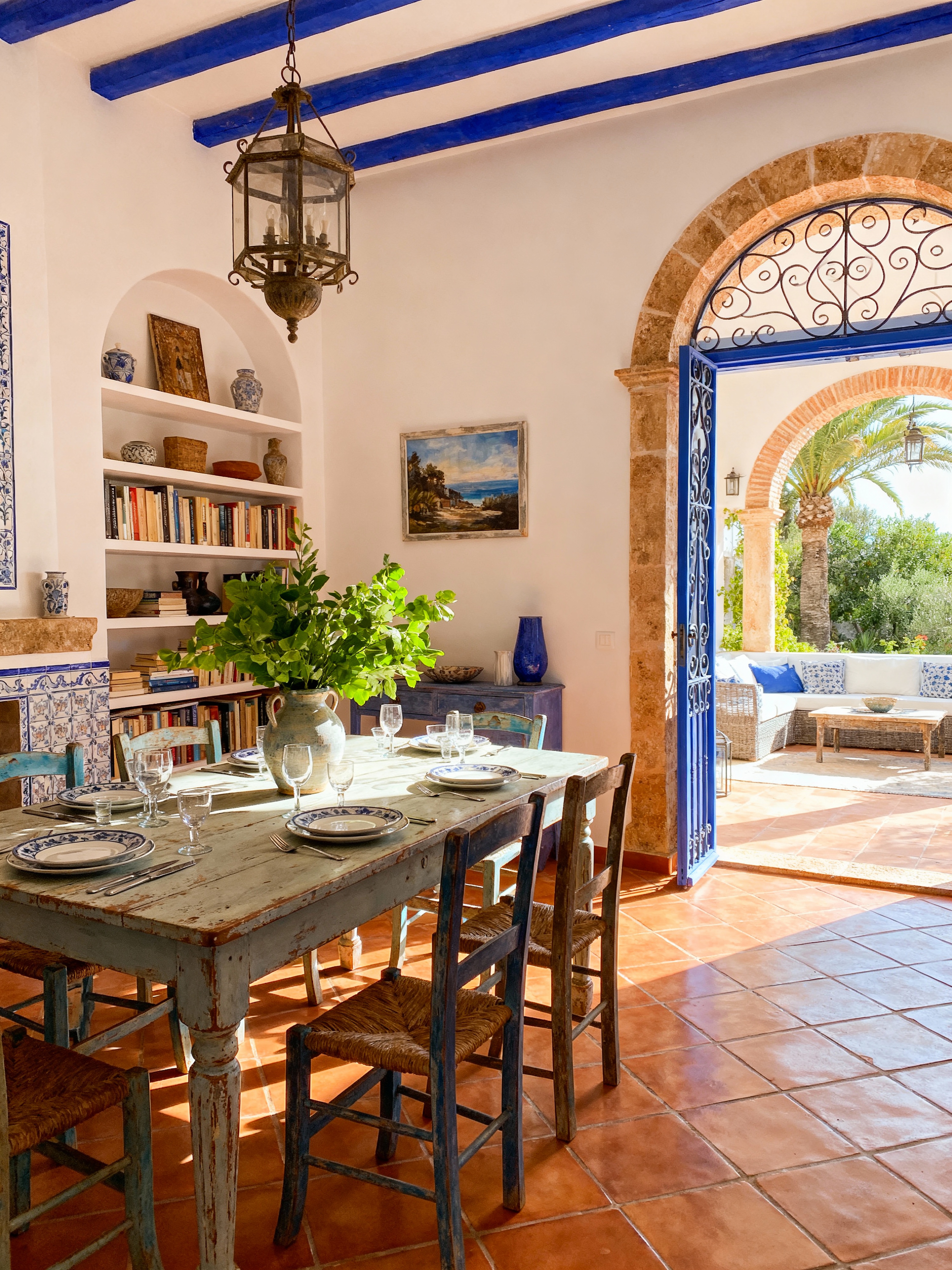 dining room with mediterranean style with plant and plates, cutlery and glasses on dining table and dining table and bookshelves and light or chandelier and dining table chairs and painting or photo on wall and vase. . with terracotta tiles and rustic charm and arched doorways and wrought iron and sun-drenched and outdoor living and warm earth tones and blue and white