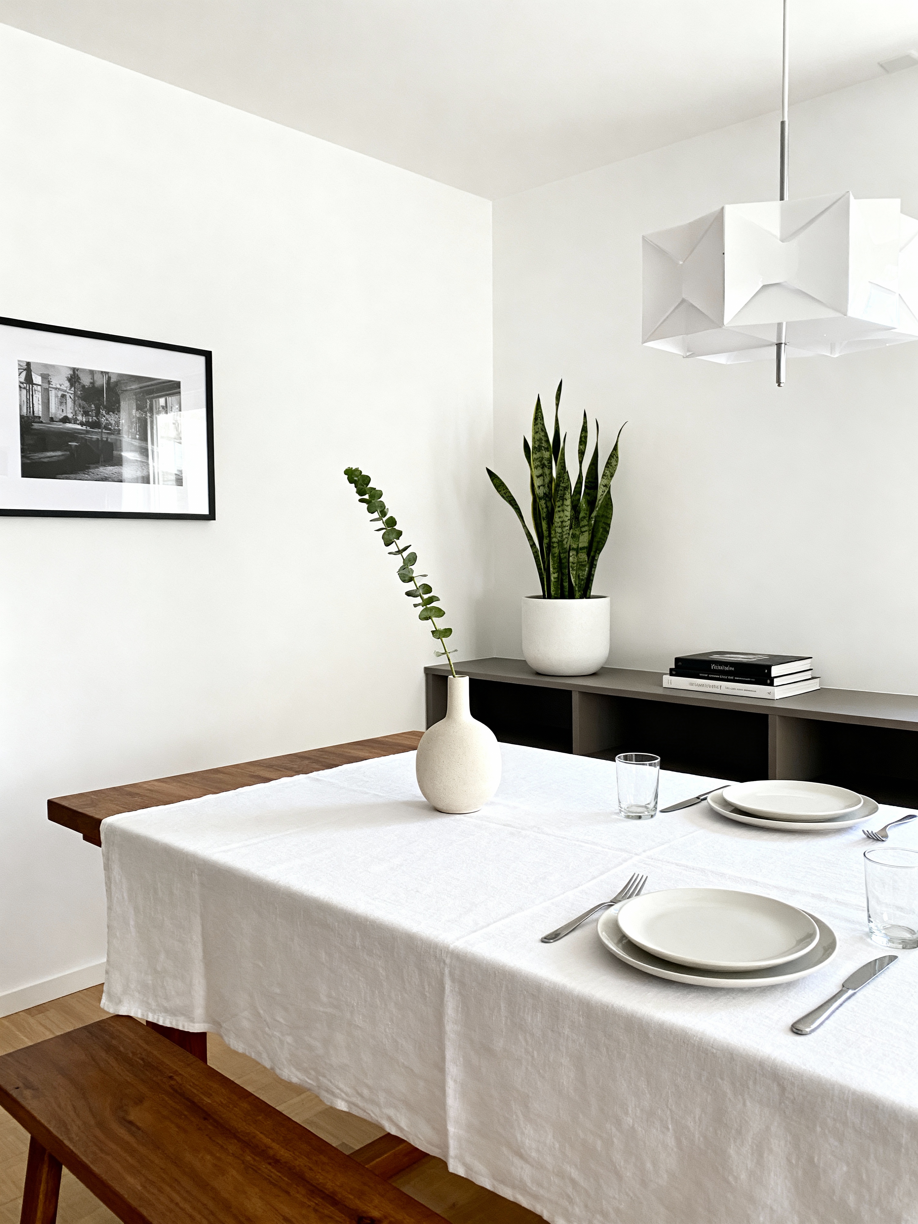 dining room with minimalist style with vase and table cloth and plant and painting or photo on wall and bookshelves and dining table and light or chandelier and plates, cutlery and glasses on dining table. . with focus on the shape, colour and texture of just a few of essential elements and an open floor plan and functional furniture and clean lines and lots of light and a monochromatic palette with colour used as an accent and focus on the shape, colour and texture of just a few of essential elements