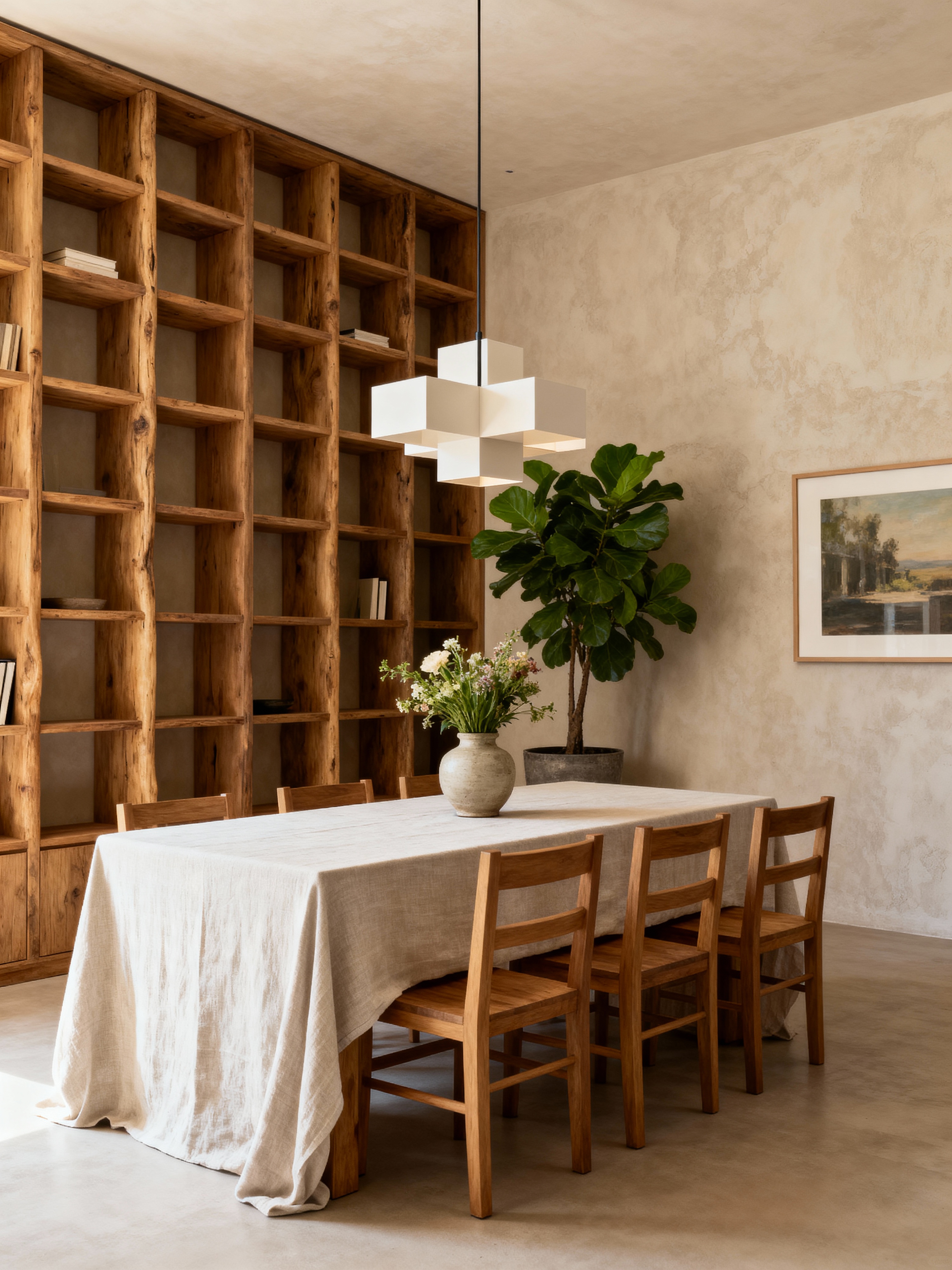 dining room with modern style with plant and light or chandelier and painting or photo on wall and vase and bookshelves and table cloth and dining table and dining table chairs. . with open and natural lighting and natural materials and elements and simple, clean lines and simplistic furniture and practicality and functionality and neutral walls and textures and open and natural lighting