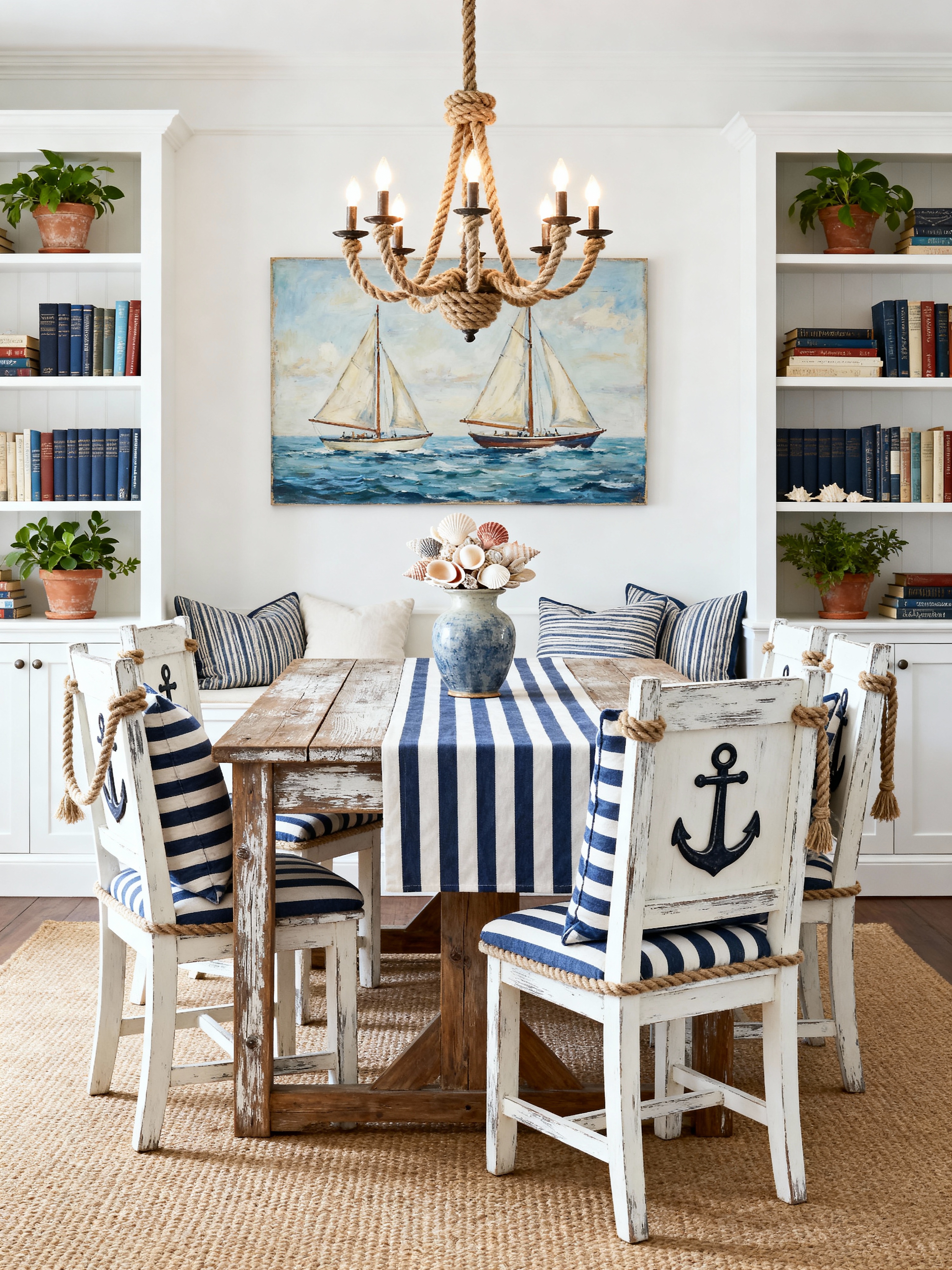 dining room with nautical style with dining table chairs and table cloth and painting or photo on wall and bookshelves and plant and light or chandelier and vase and dining table. . with seaside charm and striped patterns and sailboat elements and weathered wood and crisp white and anchor motifs and rope details and ocean inspiration