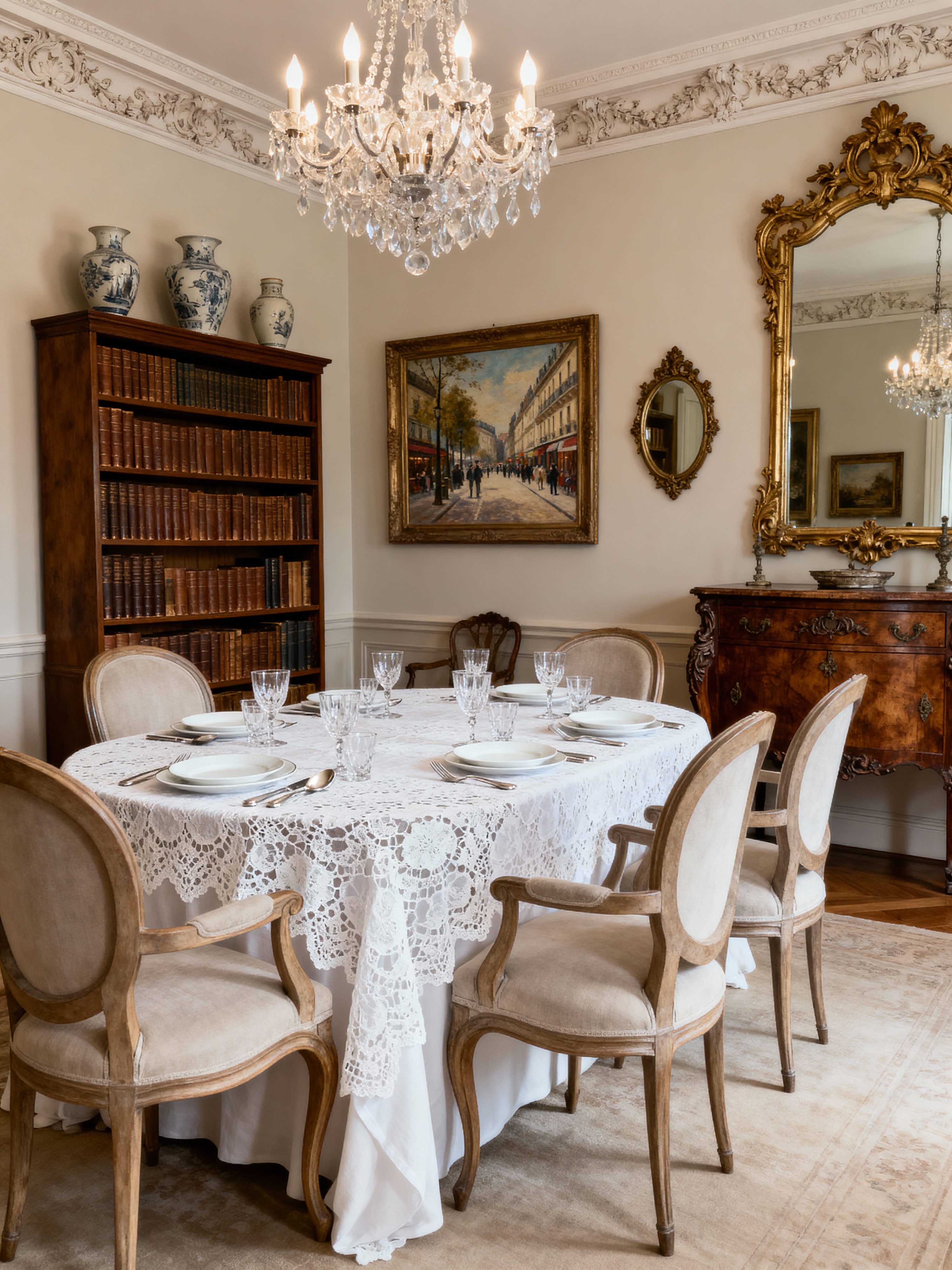 dining room with parisian style with vase and bookshelves and dining table and painting or photo on wall and dining table chairs and table cloth and plates, cutlery and glasses on dining table and light or chandelier. . with classic details and neutral palette and timeless beauty and european flair and vintage pieces and sophisticated charm and antique furniture and ornate moldings