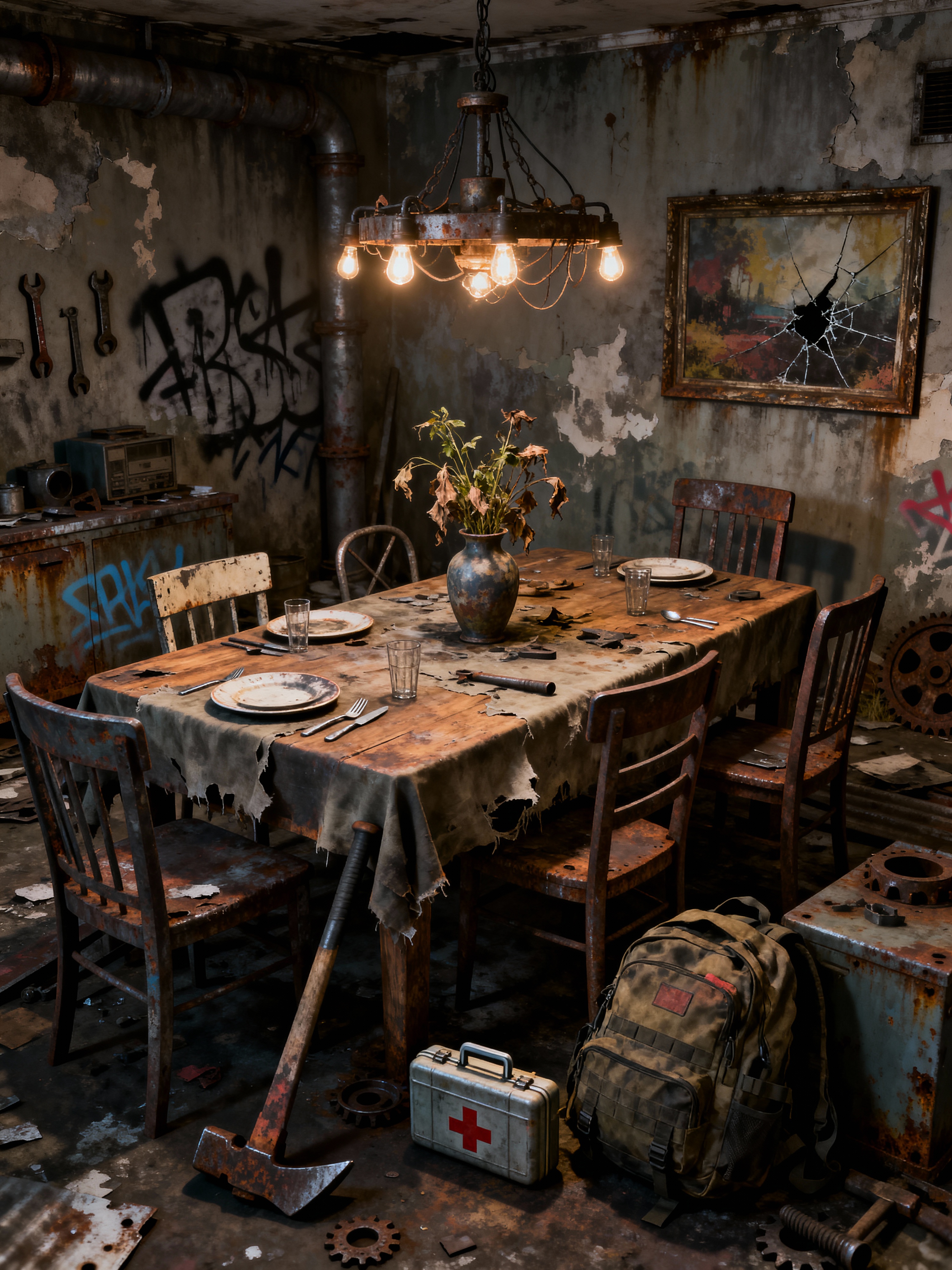dining room with post-apocalyptic style with vase and dining table chairs and plant and plates, cutlery and glasses on dining table and dining table and light or chandelier and painting or photo on wall and table cloth. . with peeling paint and clutter and industrial elements and dim lighting and scavenged decor and survival-inspired and rusted metal and graffiti on walls