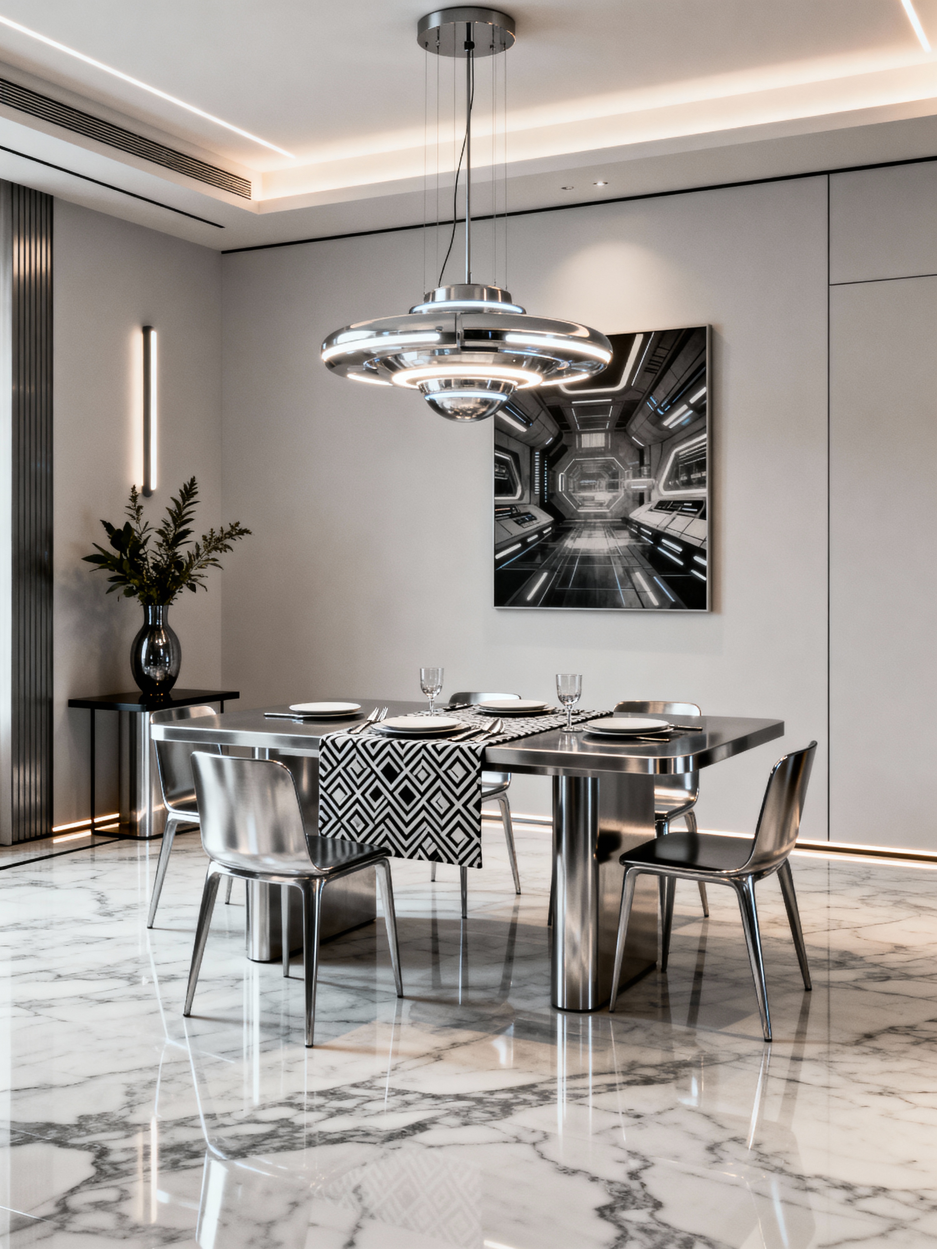 dining room with retro futuristic style with plant and vase and table cloth and light or chandelier and dining table chairs and painting or photo on wall and plates, cutlery and glasses on dining table and dining table. . with steel finishing and floating surfaces and futuristic interior and monochromatic palette and neutral background and bright accents and smooth polished marble and futurism minimalist interior and smooth marble
