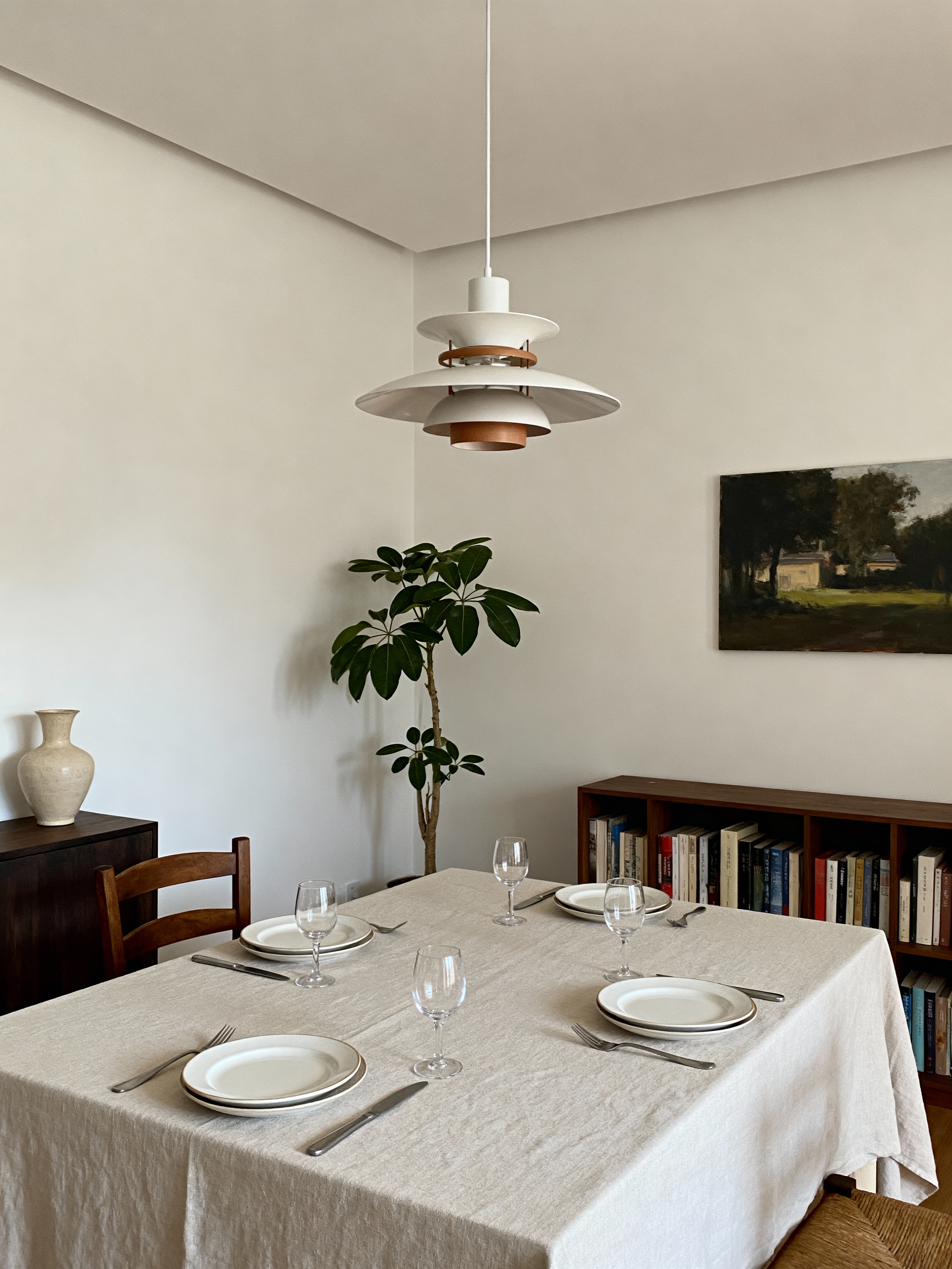 dining room with simple style with light or chandelier and table cloth and plates, cutlery and glasses on dining table and dining table and plant and painting or photo on wall and vase and bookshelves. . with uncluttered space and minimal decor and neutral colors and functional furniture and pure simplicity and understated style and essential pieces and calm atmosphere