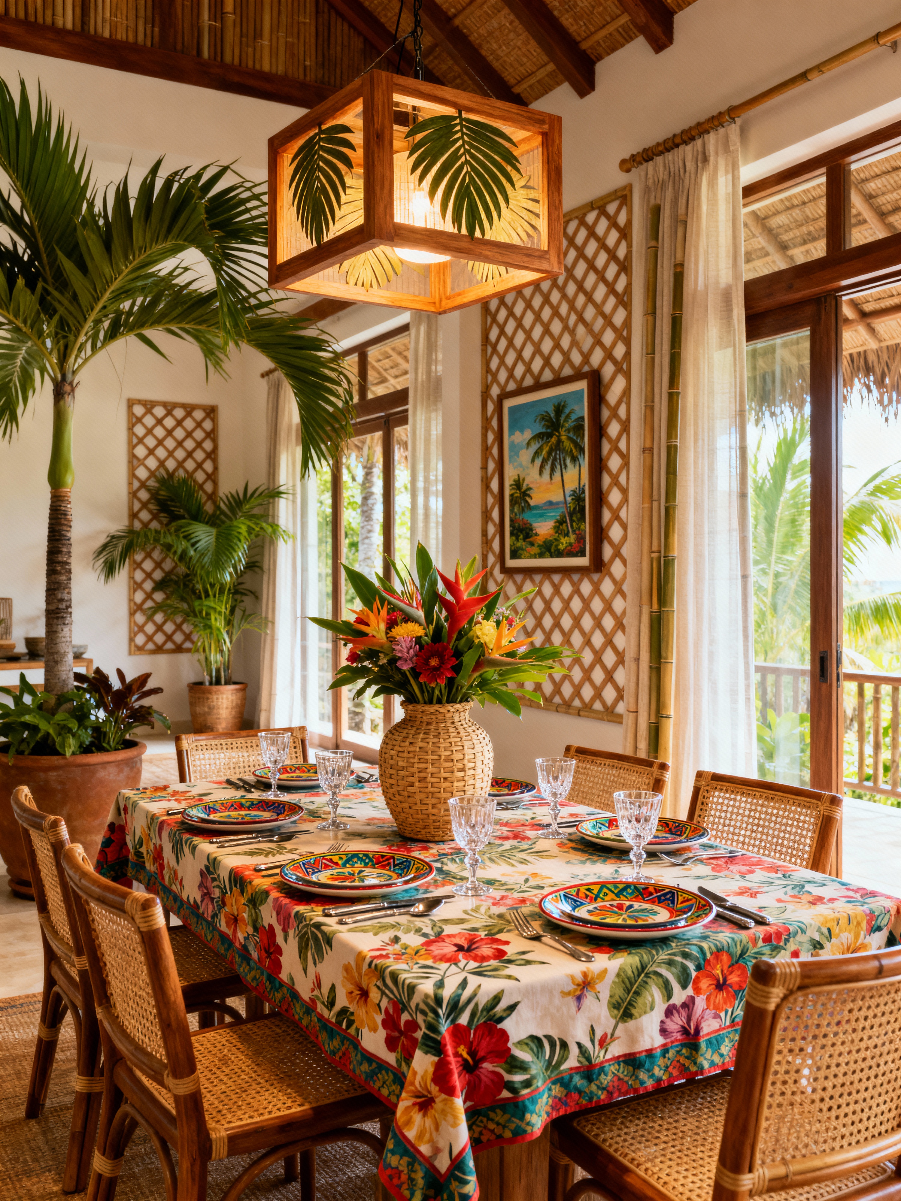 dining room with tropical style with dining table and plates, cutlery and glasses on dining table and table cloth and vase and light or chandelier and plant and dining table chairs and painting or photo on wall. . with teak and rattan and palm leaves and palm trees and cane motifs and bamboo and lattice prints and wicker