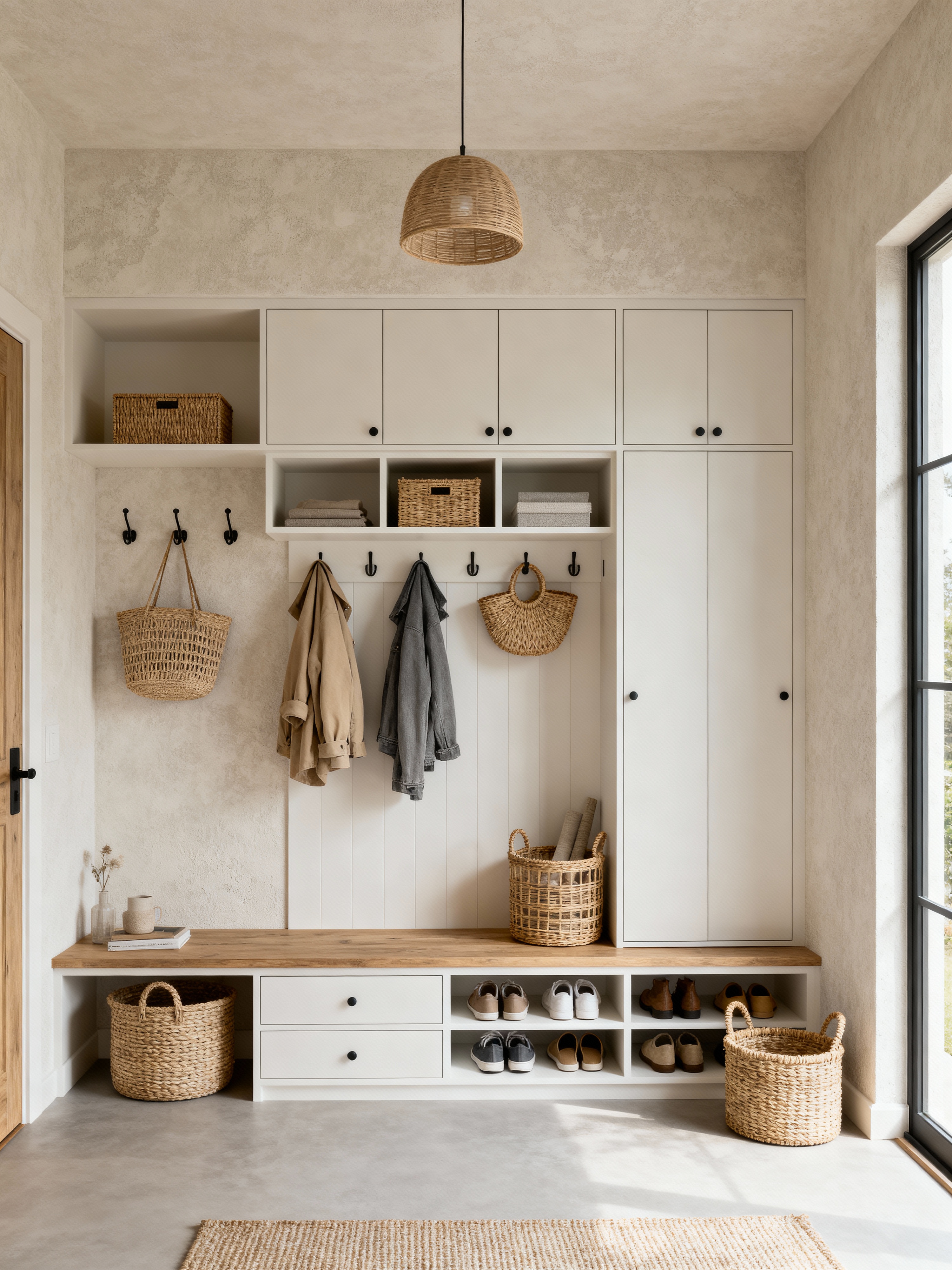 drop zone with airbnb style with lockers and wall hooks for coats and storage baskets and cabinets and high up storage and cubbies and shelves for shoes and storage drawers. . with neutral walls and textures and scandinavian style and simple color palette and simple, clean lines and simplistic furniture and open and natural lighting and natural materials and elements and practicality and functionality and neutral walls and textures