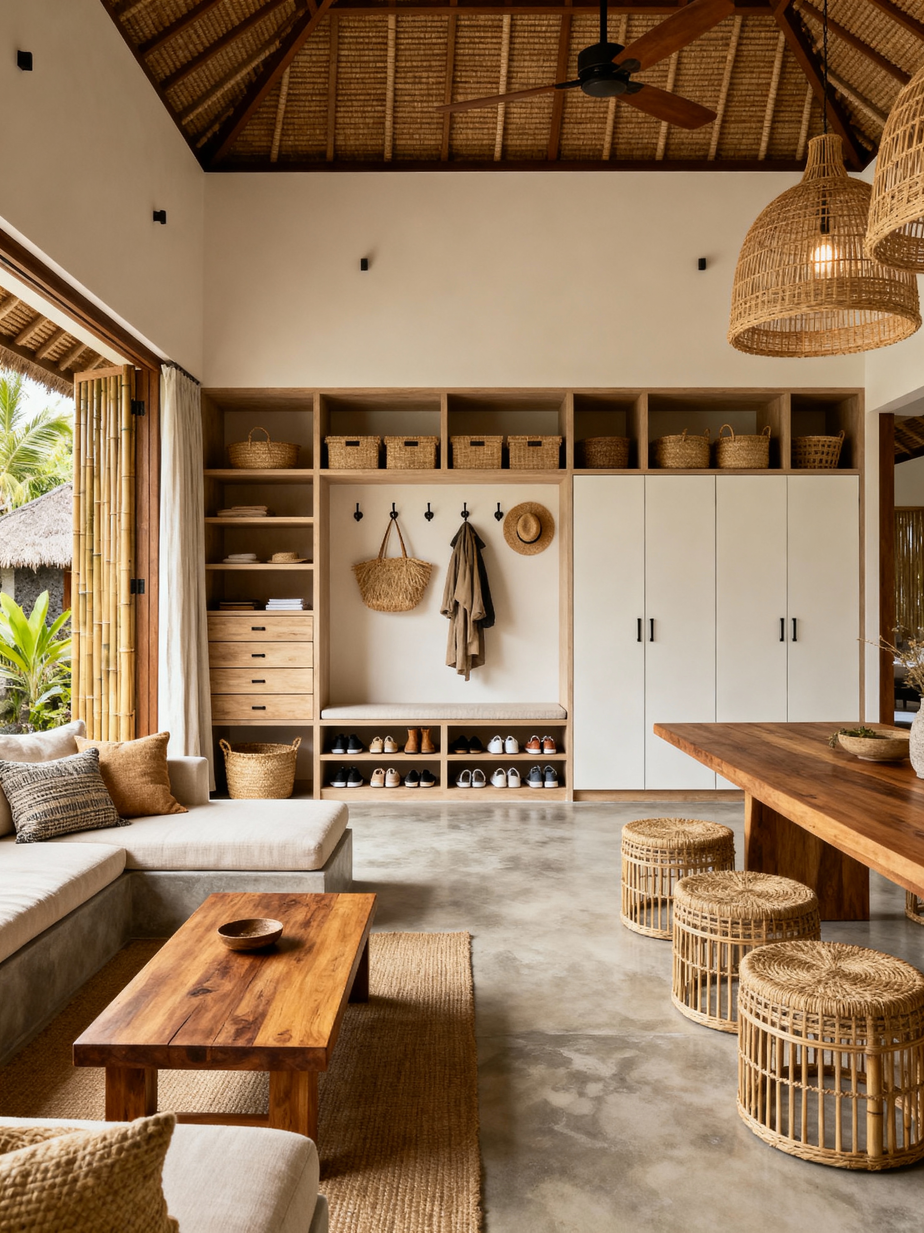 drop zone with bali style with shelves for shoes and storage drawers and cubbies and wall hooks for coats and high up storage and cabinets and lockers and storage baskets. . with raffia or bamboo accents and open high ceilings with fans and modern boho chic and microcement floors and wooden coffee and dining tables and conversation pit with pillows and woven pendant lamps and neutral color palette
