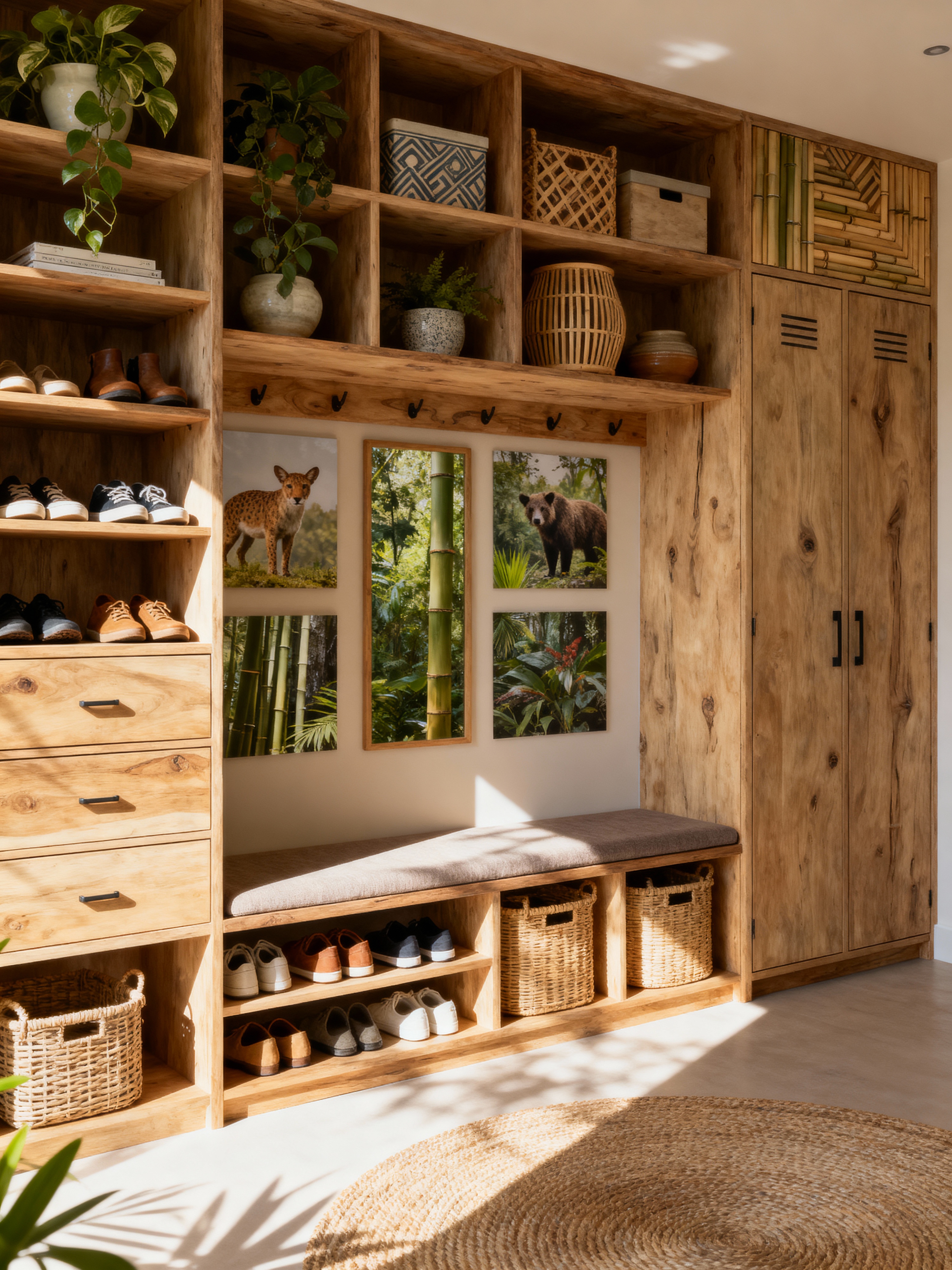 drop zone with biophilic style with shelves for shoes and storage drawers and a bench and cabinets and cubbies and storage baskets and high up storage and lockers. . with plants and ceramic materials and images of nature and wood materials and images of animals and bamboo materials and sunlight and natural patterns