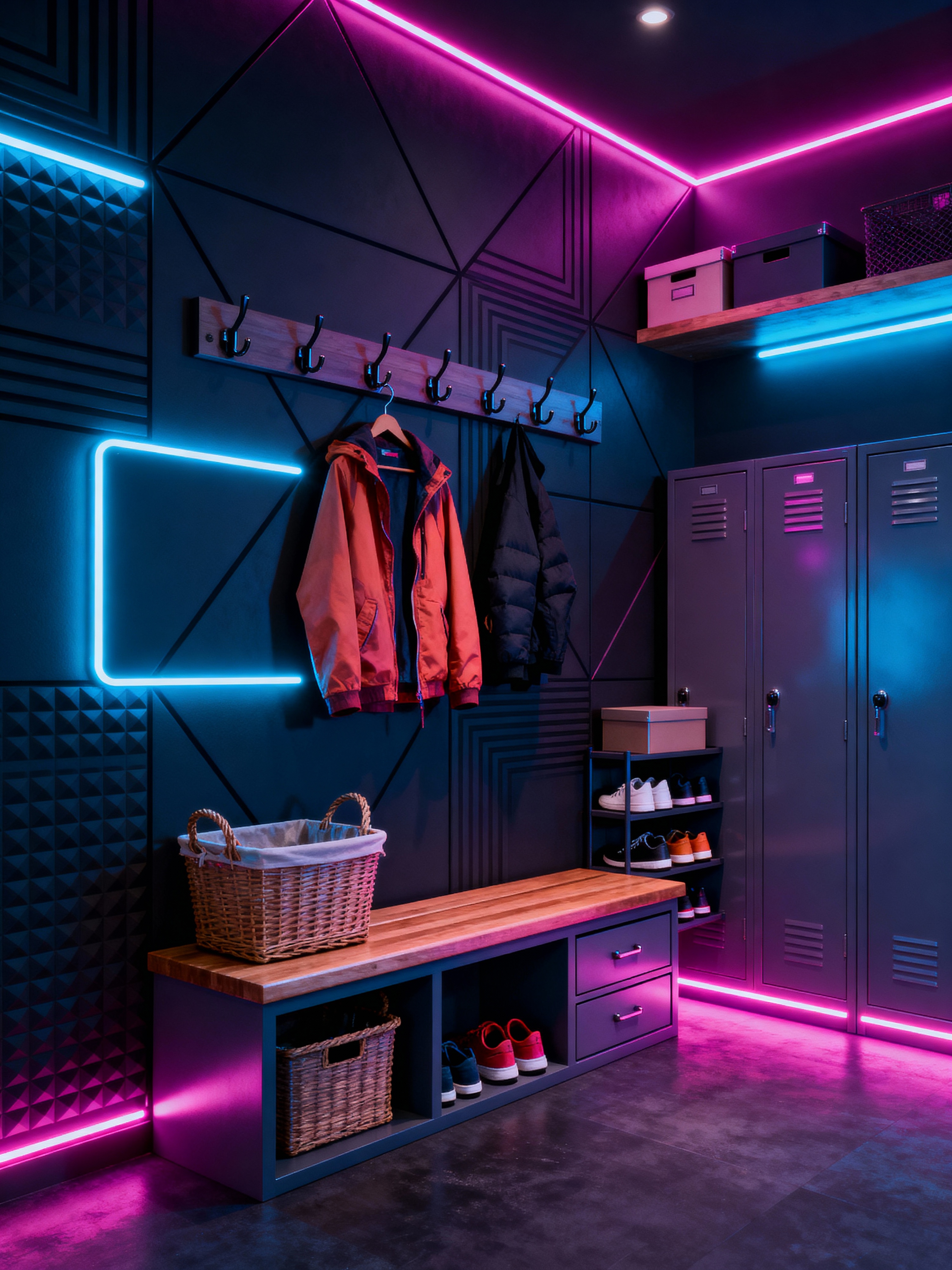 drop zone with cyberpunk style with wall hooks for coats and storage baskets and storage drawers and shelves for shoes and lockers and a bench and cubbies and high up storage. . with synthwave and color lights glow and synthetic objects and cyberpunk lights and minimalist and strong geometric walls and cyberpunk style and dark night