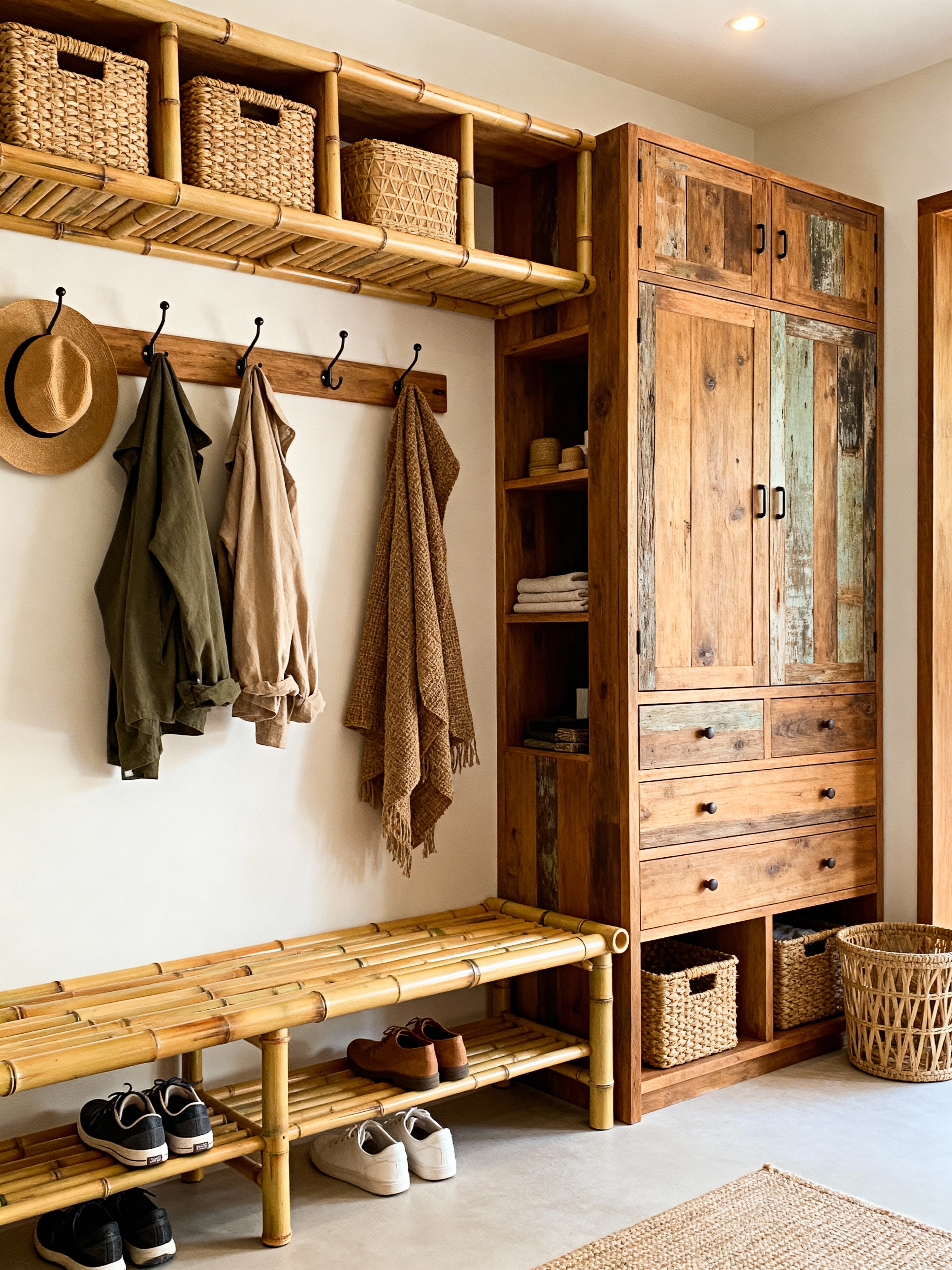 drop zone with eco-friendly style with shelves for shoes and wall hooks for coats and cabinets and storage drawers and cubbies and storage baskets and lockers and a bench. . with non-toxic finishes and bamboo furniture and reclaimed wood and environmentally conscious and energy efficient and sustainable materials and organic textiles and recycled elements
