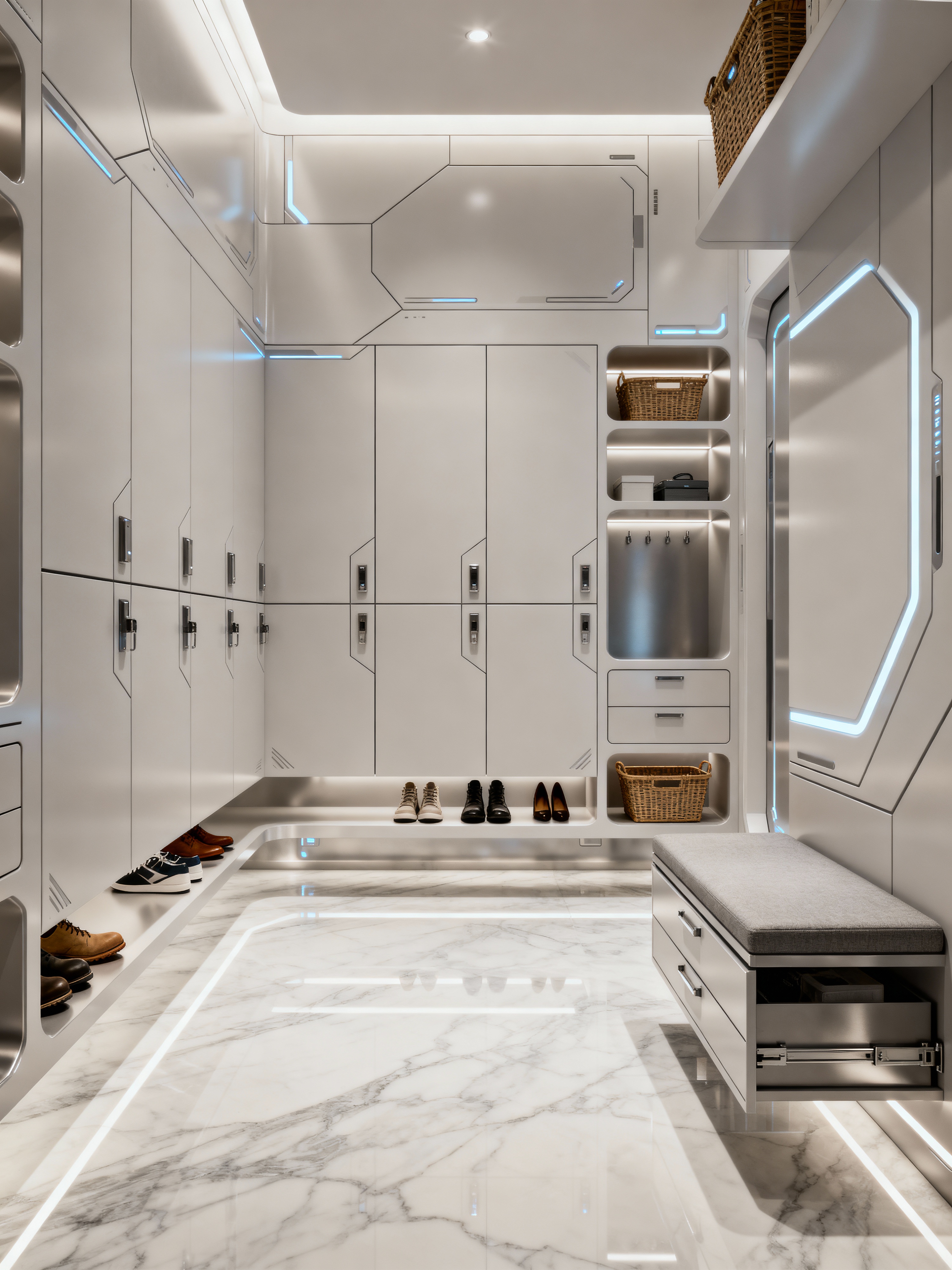 drop zone with futuristic style with lockers and cubbies and cabinets and shelves for shoes and high up storage and a bench and storage baskets and storage drawers. . with light colors and steel finishing and spaceship interior and smooth marble and smooth polished marble and strong geometric walls and minimalist clean lines and floating surfaces