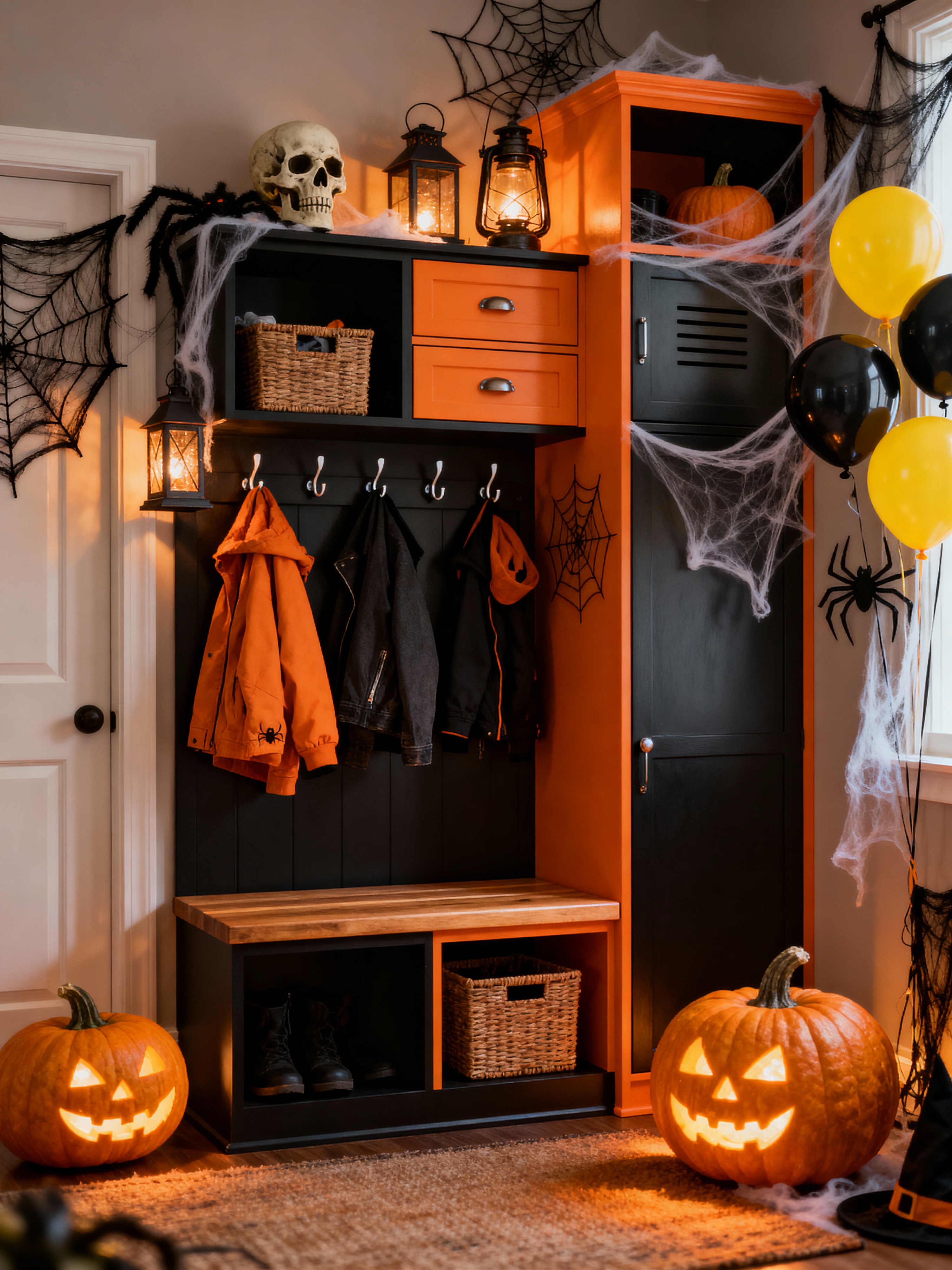 drop zone with halloween style with cabinets and cubbies and a bench and high up storage and storage drawers and lockers and storage baskets and wall hooks for coats. . with lanterns and spiderwebs and cobwebs and cobwebs and human skulls and lanterns and yellow black balloons and glowing pumpkins