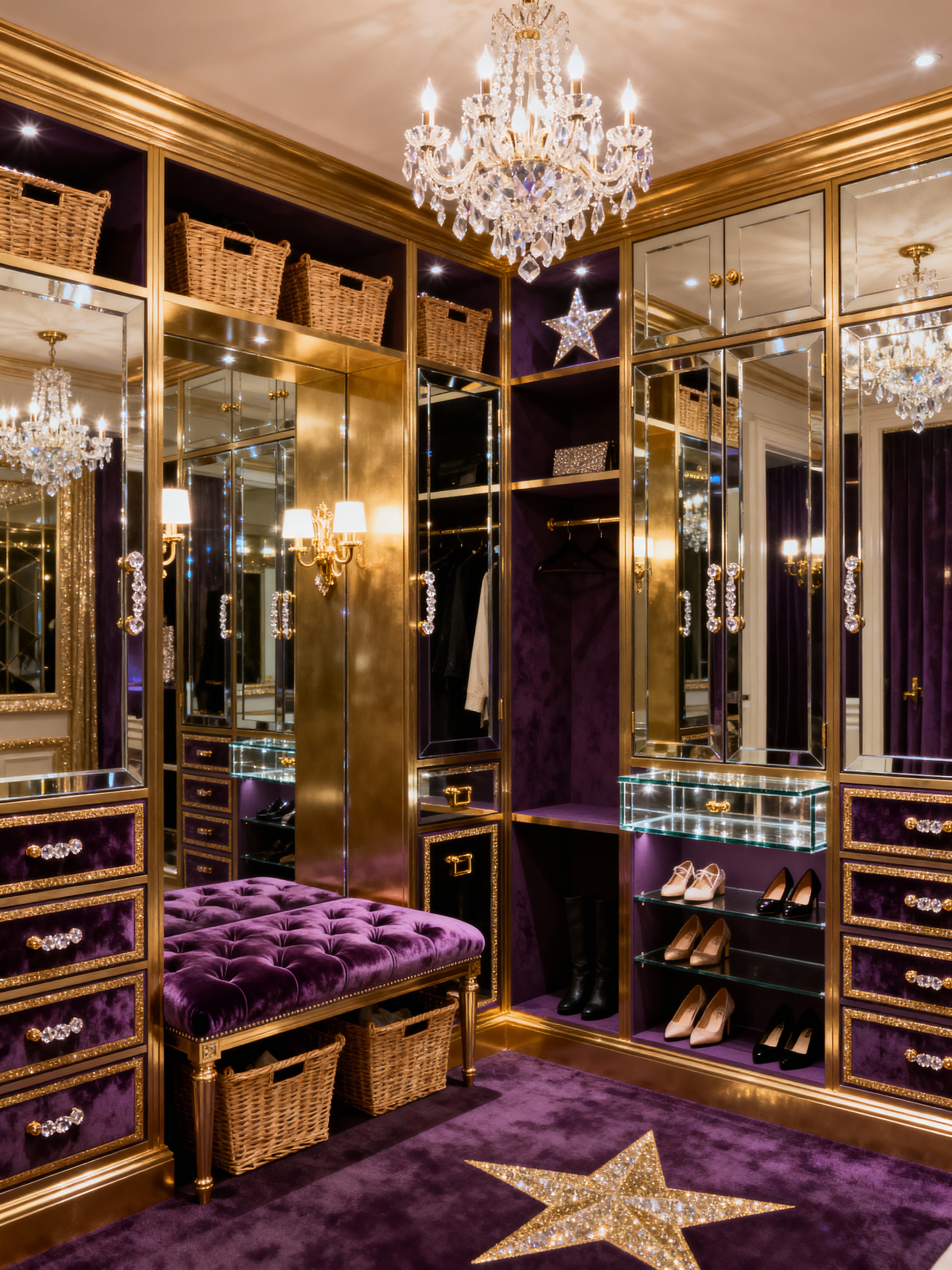 drop zone with hollywood glam style with storage baskets and storage drawers and cabinets and high up storage and a bench and shelves for shoes and lockers and cubbies. . with velvet upholstery and opulent details and star quality and luxurious fabrics and glamorous style and mirrored surfaces and crystal chandeliers and dramatic lighting