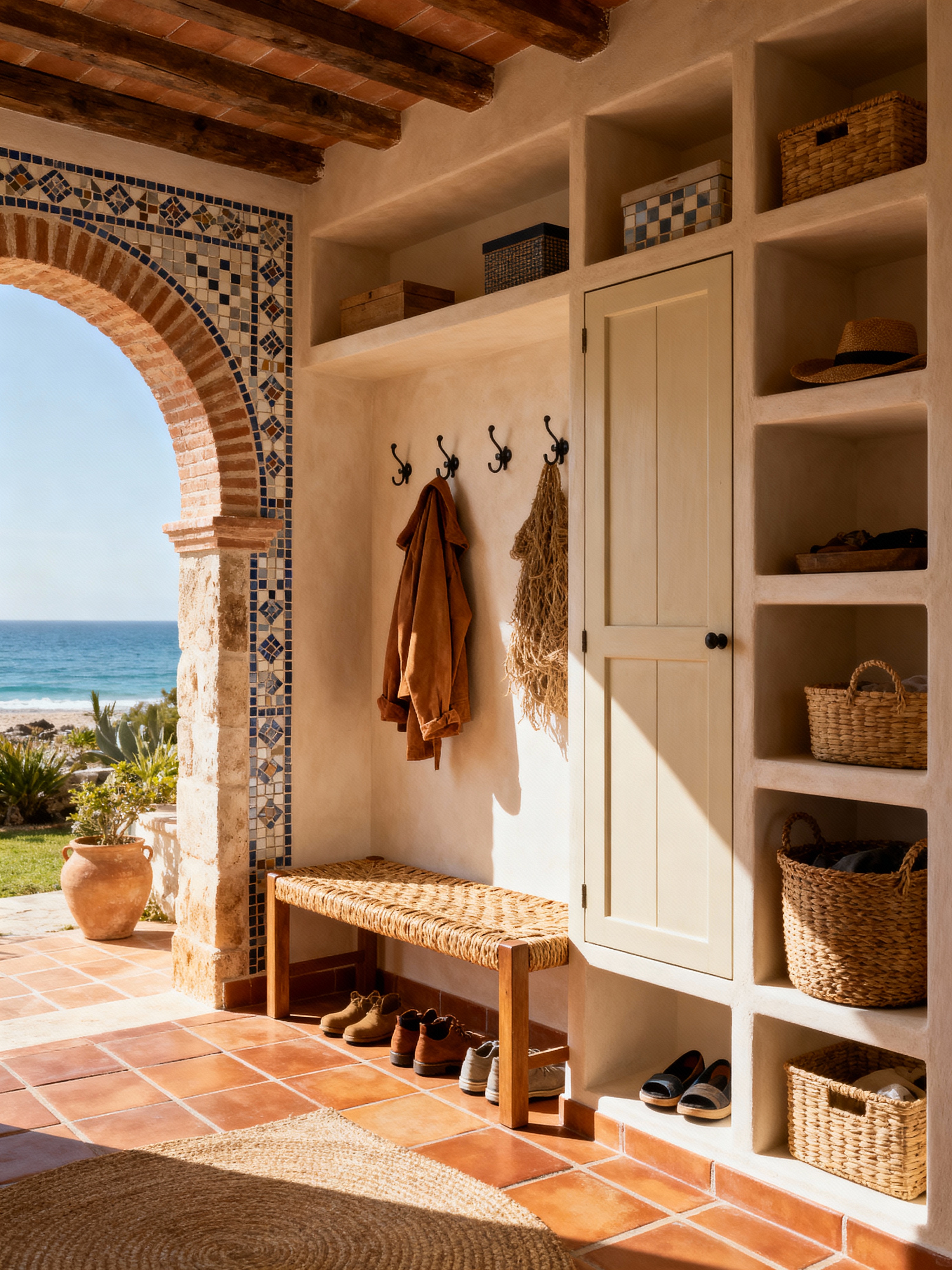 drop zone with mediterranean style with a bench and wall hooks for coats and cabinets and lockers and shelves for shoes and storage baskets and high up storage and cubbies. . with warm earth tones and arched doorways and rustic charm and sun-drenched and outdoor living and mosaic patterns and terracotta tiles and coastal influence