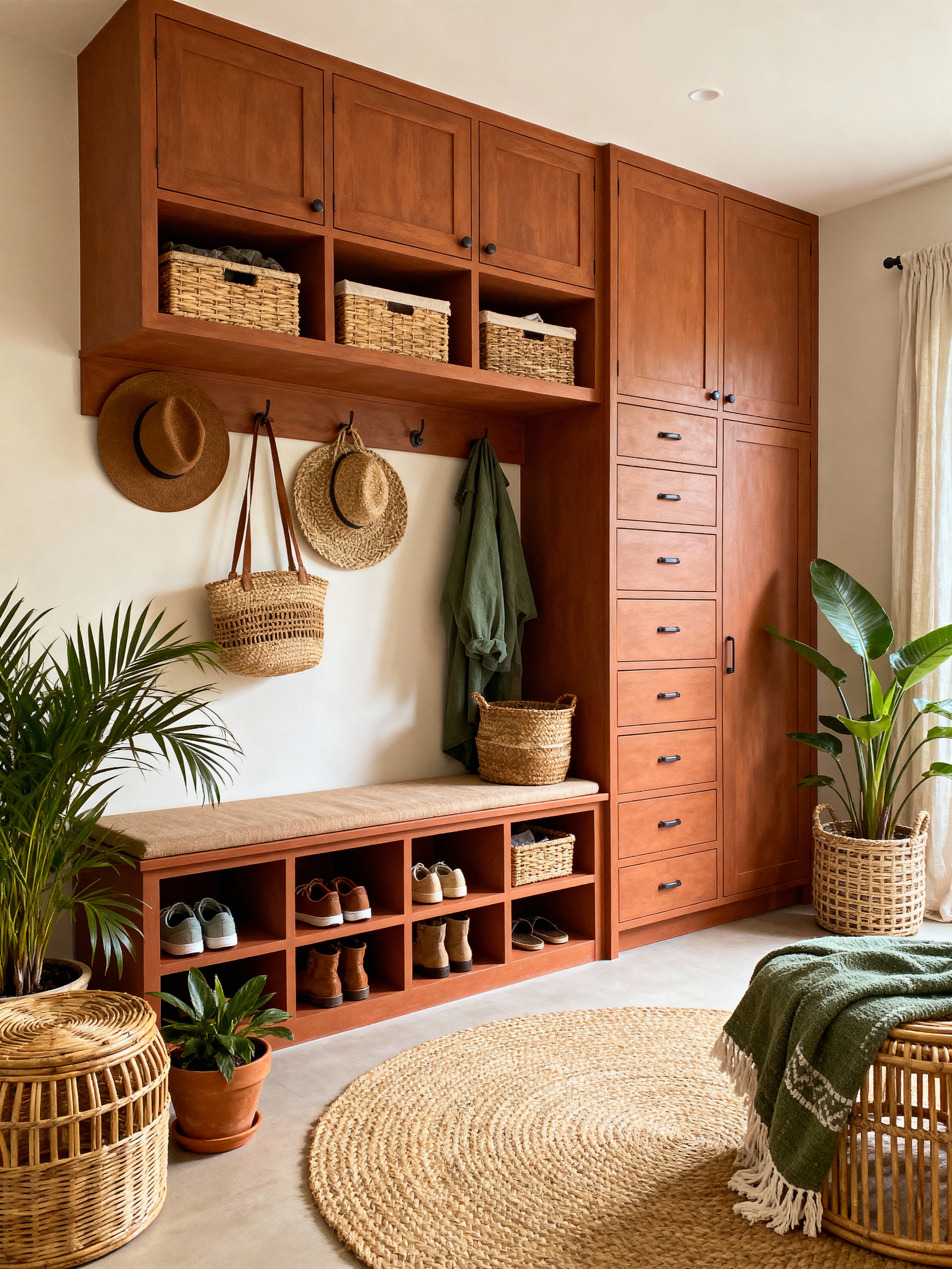 drop zone with modern boho style with high up storage and cabinets and storage drawers and a bench and cubbies and shelves for shoes and lockers and storage baskets. . with potted plants and layered textures and woven textures and rattan furniture and jute rugs and earthy tones and bohemian style and cotton textiles