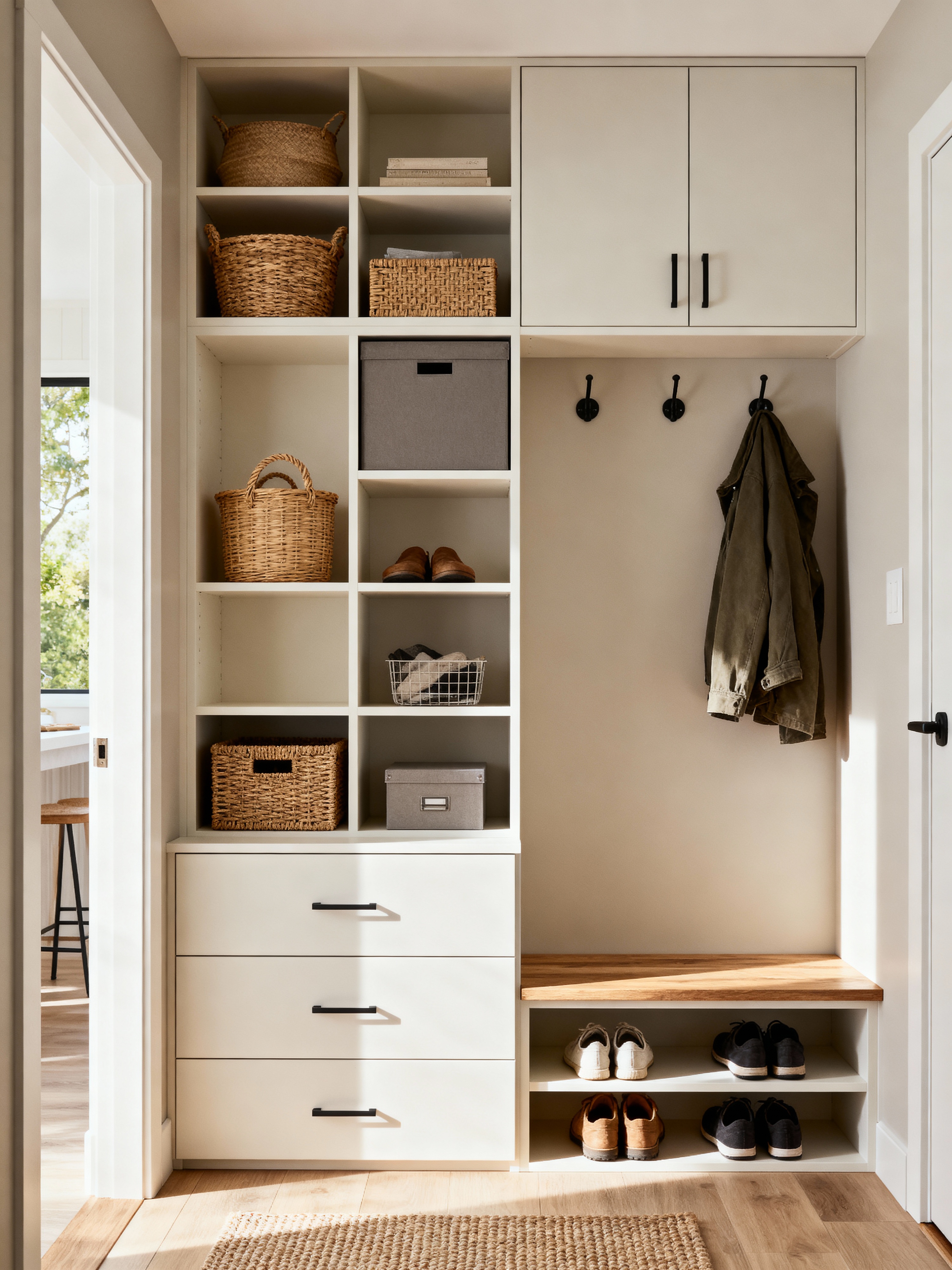drop zone with modern style with storage baskets and shelves for shoes and storage drawers and cubbies and cabinets and wall hooks for coats and a bench and lockers. . with simple, clean lines and simplistic furniture and practicality and functionality and natural materials and elements and open and natural lighting and neutral walls and textures and simple, clean lines and simplistic furniture