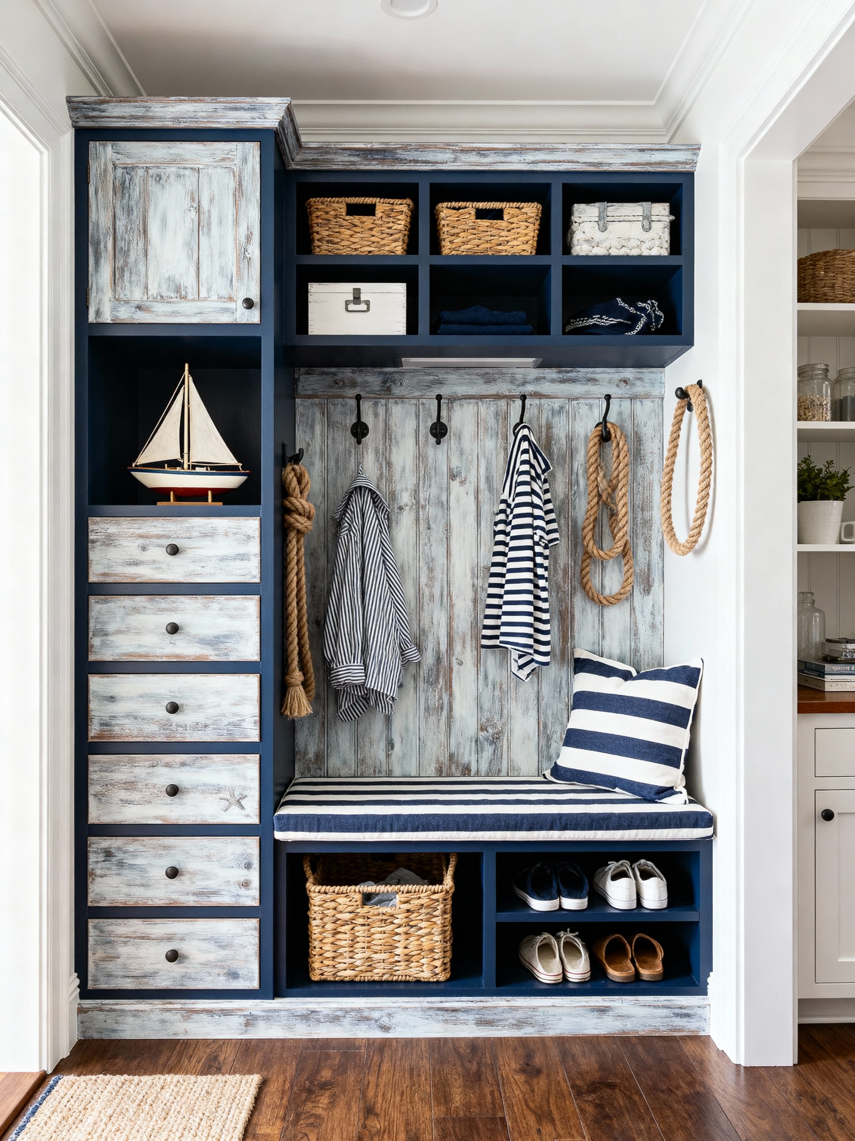 drop zone with nautical style with storage drawers and storage baskets and a bench and wall hooks for coats and shelves for shoes and lockers and high up storage and cabinets. . with ocean inspiration and seaside charm and navy blue and weathered wood and striped patterns and crisp white and sailboat elements and rope details