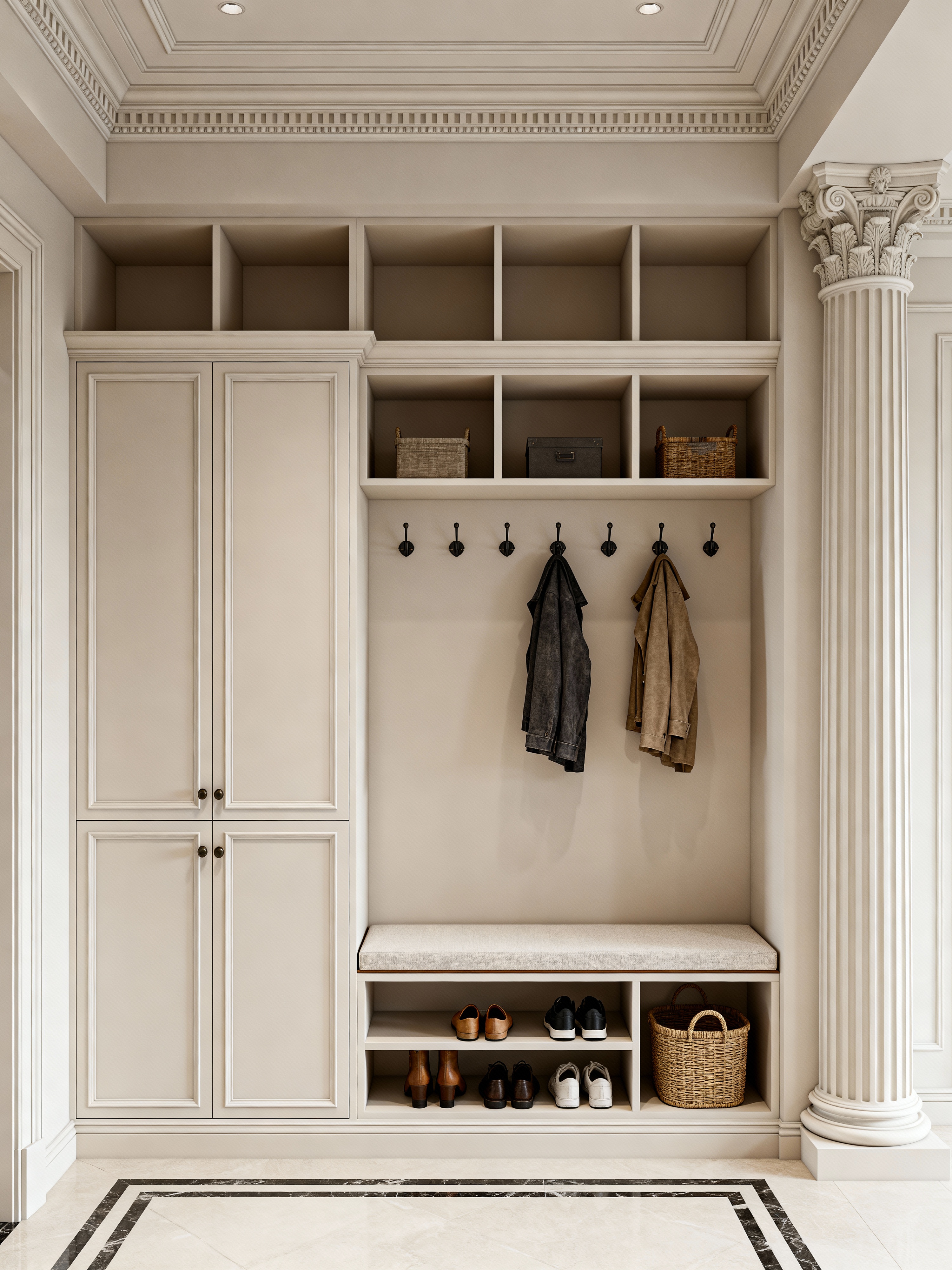 drop zone with neoclassic style with high up storage and cubbies and wall hooks for coats and a bench and shelves for shoes and cabinets and storage baskets and lockers. . with geometric decorative elements and symmetric layouts and classical architectural details and emphasized horizontal and vertical lines and greek columns and elegant and sophisticated and high ceilings and timeless furniture