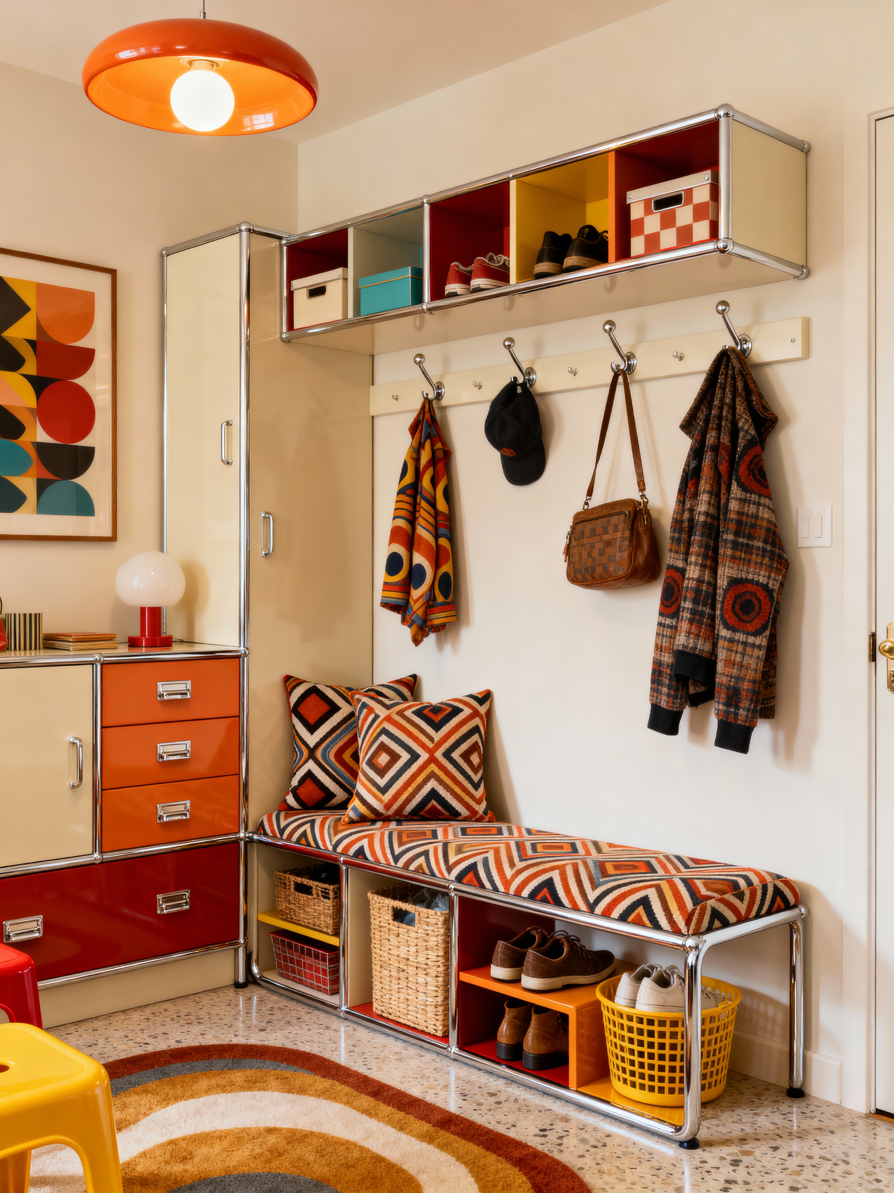 drop zone with retro style with storage drawers and cabinets and wall hooks for coats and cubbies and high up storage and shelves for shoes and storage baskets and a bench. . with nostalgic pieces and funky decor and vintage revival and chrome accents and plastic furniture and bold patterns and groovy vibes and geometric shapes