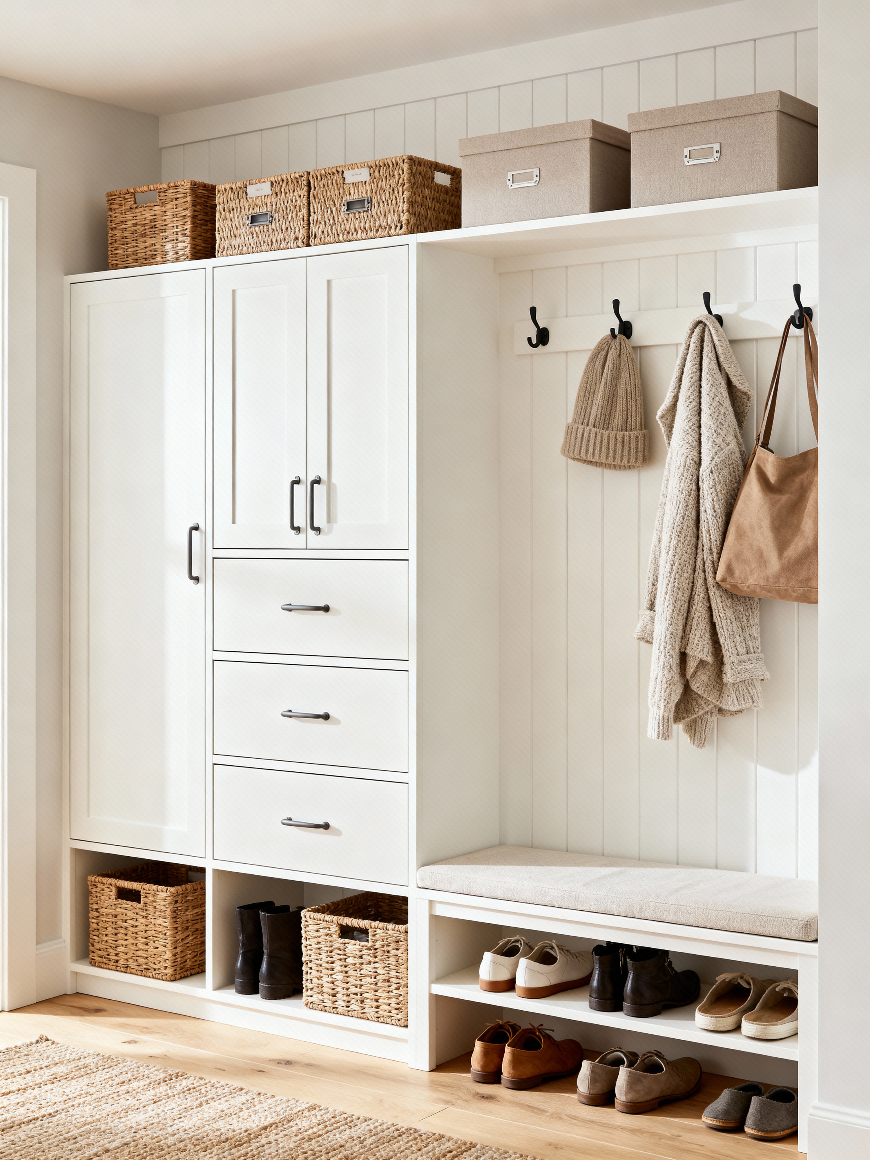 drop zone with scandinavian style with cabinets and shelves for shoes and storage drawers and lockers and storage baskets and high up storage and a bench and wall hooks for coats. . with functional furniture and minimalist design and neutral palette and light wood and textured fabrics and hygge and clean lines and white decor