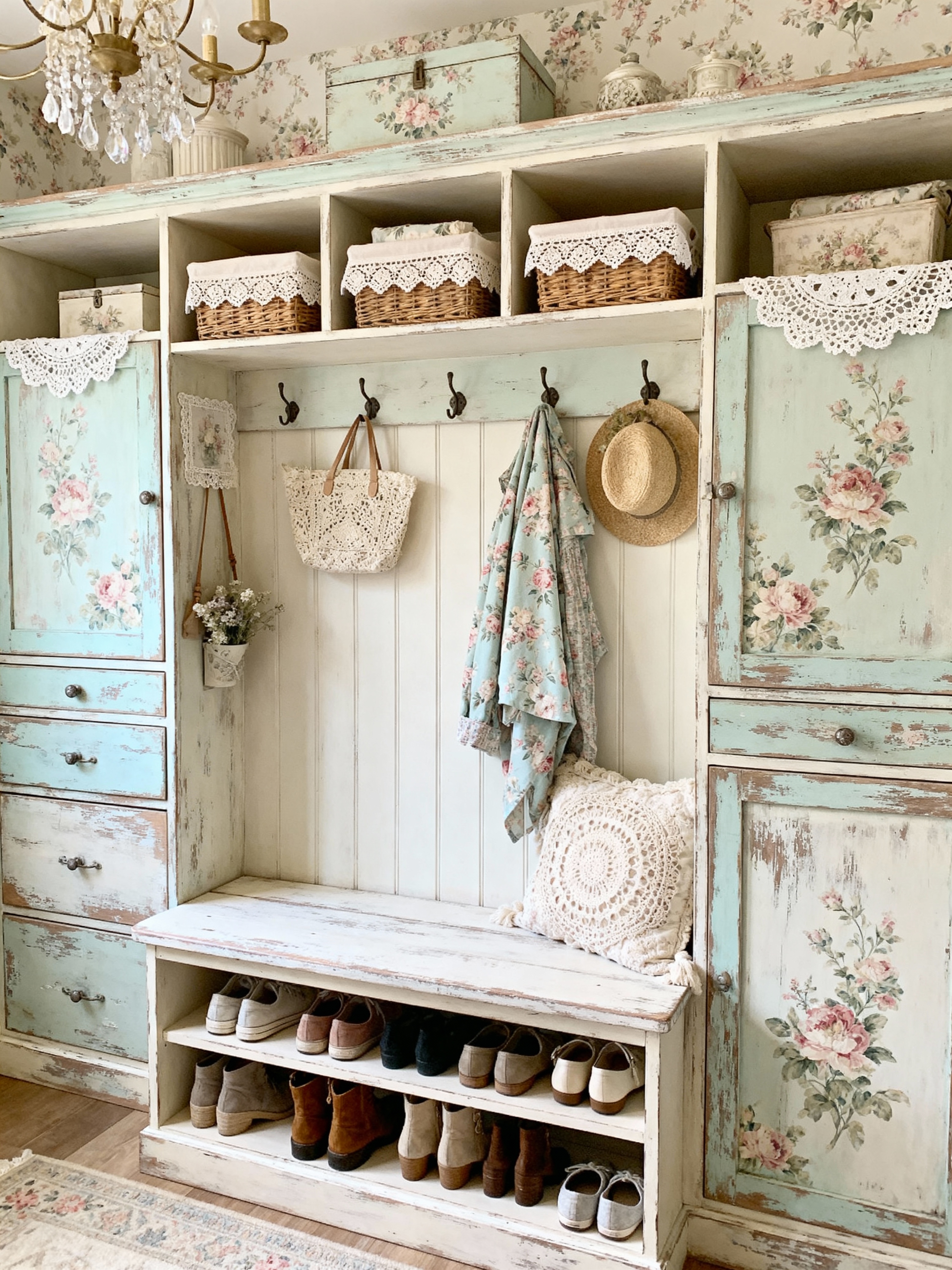 drop zone with shabby chic style with high up storage and cubbies and storage baskets and storage drawers and shelves for shoes and cabinets and a bench and wall hooks for coats. . with weathered finishes and floral patterns and antique lace and distressed furniture and cottage feel and soft textures and pastel colors and delicate details